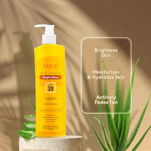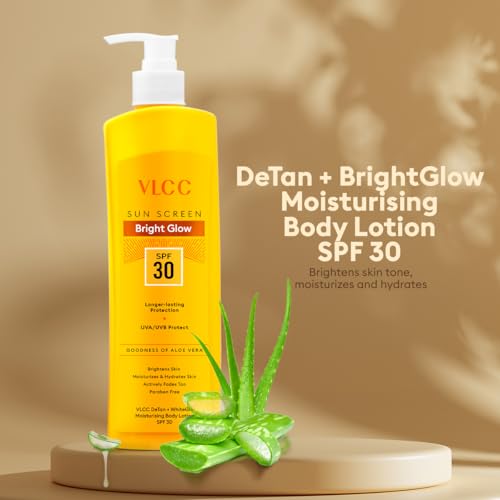 VLCC de tan plus white glow moisturising body lotion spf 30 pa+++ is an effective formulation that moisturises and soothes the skin while offering sun protection against uva and uvb rays thus preventing premature aging and tanning. Enriched with aloe vera it soothes the skin brightens skin tone moisturises and hydrates while fading tan leaving skin nourished and glowing. How to use 1. Massage gently all over face neck hand & arms and other sun exposed body parts. 2. Best to be applied 15-20 minutes prior to stepping out in the sun. Reapply in case of long duration sun exposure 3. Stay Protected with Broad Spectrum Sun Protection