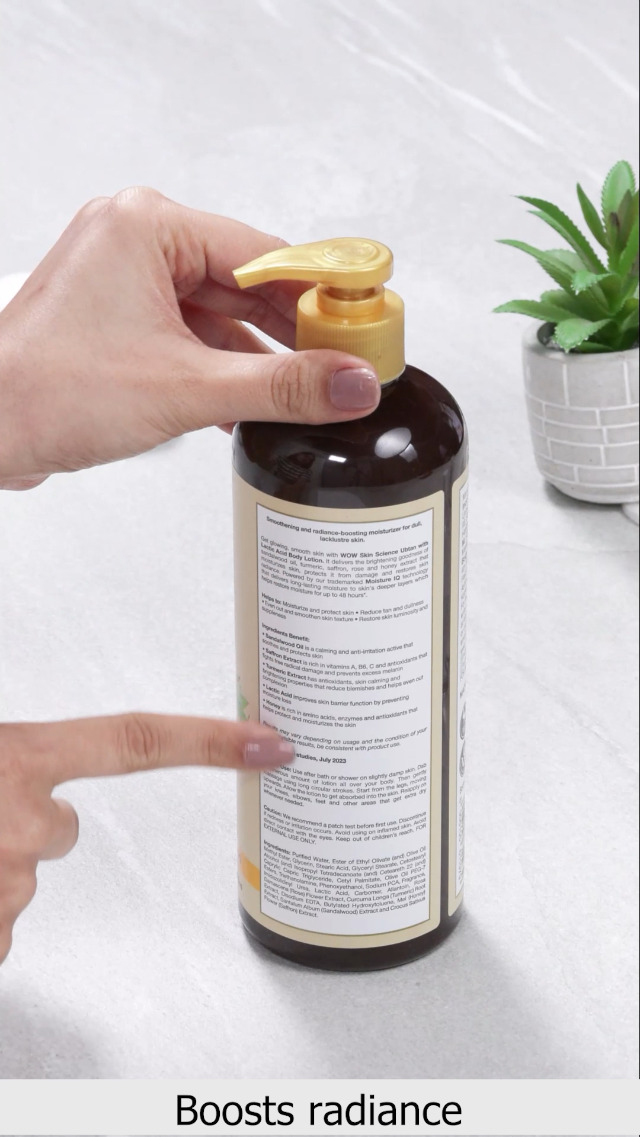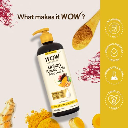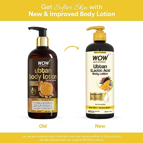 Indulge your body with traditional Indian beauty actives and help rejuvenate your tanned rough uneven skin tone with WOW Skin Science Ubtan Body Lotion. It contains radiance-boosting Infusion of Saffron Extract Sandalwood Oil Rose Water and Turmeric Root Oil. The actives help to reduce tan repair skin damage even out skin tone smoothen skin texture and improve skin luminosity. It is non-sticky and non-greasy lotion that gets easily absorbed into skin leaving it velvety smooth. It has soothing natural fragrance that revives the senses. It is suitable for all skin types and is ideal for dry lacklustre rough skin. It helps to enhance complexion and give it a natural radiance. It is ideal for boosting all over softness and smoothness of your body. The Saffron Extract in the lotion is known to have skin-repairing and skin-brightening properties that enhance complexion and improve skin texture. Turmeric Root Oil protects skin from irritation nourishes and repair skin damage. Rose Water is a mineral-rich skin coolant and toner that helps to firm up the skin even out skin tone and give it a soft glow. Hyaluronic Acid is a natural moisturizer that supports collagen structure. Sandalwood Oil an anti-irritation and skin calming active that helps to remove skin imperfections control excess oil and soothe skin; and Sweet Almond Oil is rich in vitamin E antioxidants and essential fatty acids that keep skin moisturized and smoothen fine lines.