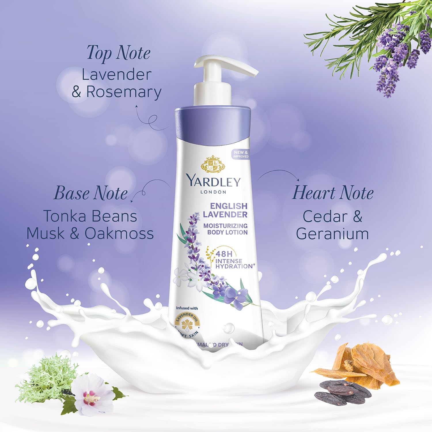 Indulge in the ultimate skin-pampering experience with Yardley London's English Lavender Moisturizing Body Lotion. This luxurious lotion is a harmonious blend of natural floral extracts revitalising lavender essence nourishing shea butter and the magic of Hyaluronic acid all designed to lavish your skin with hydration and care. The revitalising essence of lavender transforms your daily skincare routine into a fragrant and elegant experience. Say goodbye to dry dull skin as this lotion deeply hydrates and softens leaving your skin velvety-smooth throughout the day. Infused with nourishing shea butter it provides your skin with the pampering it deserves while Hyaluronic acid locks in moisture ensuring that your skin remains hydrated and supple. But that's not all Yardley London's English Lavender Moisturizing Body Lotion goes the extra mile by offering germ shield protection. It keeps your skin not only soft and fragrant but also healthier. With over 250 years of heritage Yardley London is a trusted name in classic premium floral fragrances and body products. Immerse yourself in the essence of Englishness luxury quality and natural fragrances with every use. Rediscover the joy of soft fragrant and healthy skin with Yardley London's English Lavender Moisturizing Body Lotion a perfect blend of tradition and innovation for the modern woman.