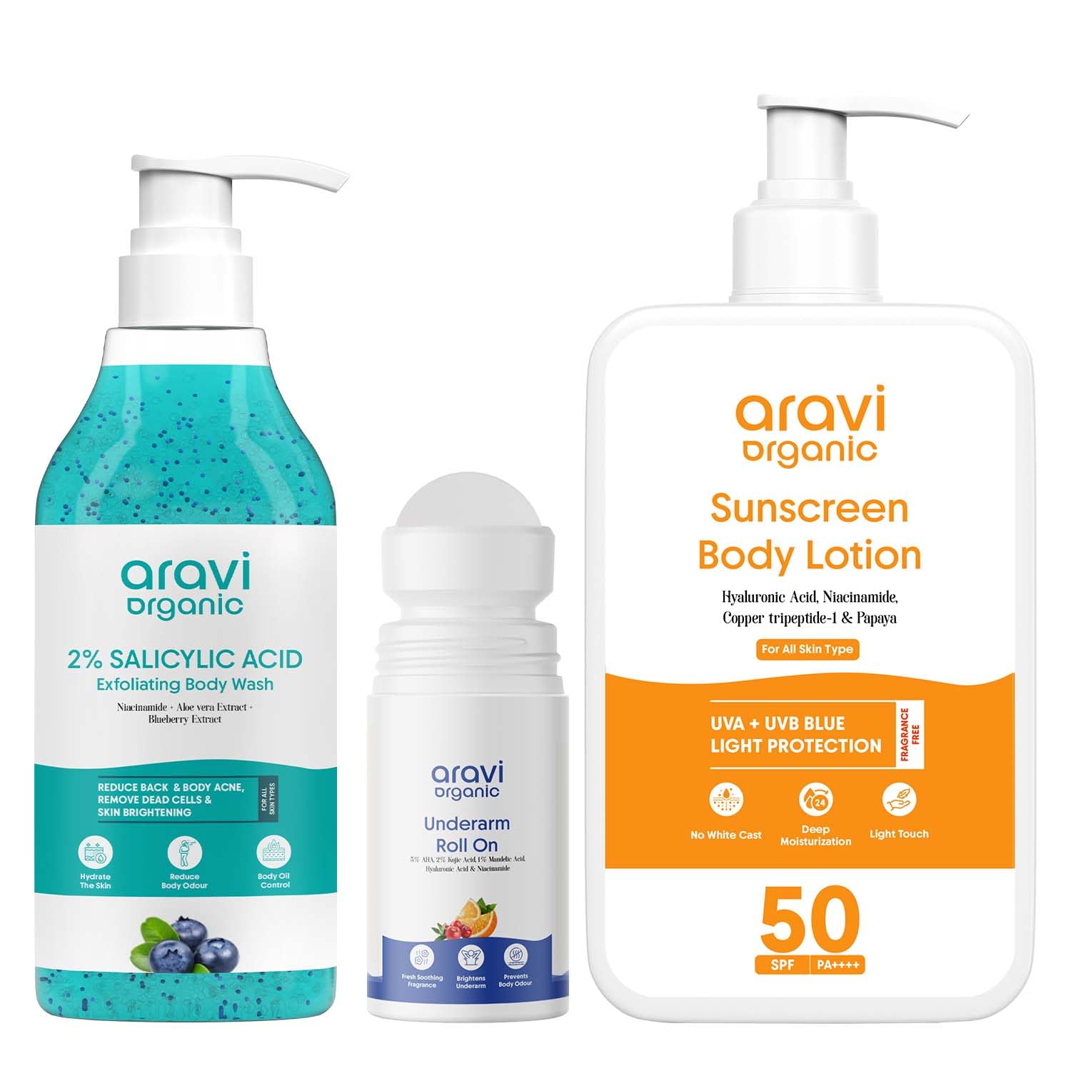 Achieve fresh clean and protected skin with the Aravi Organic Body Wash Under Arm Roll On and Sunscreen Body Lotion â a powerful trio that ensures your skin feels revitalized nourished and shielded from the sun's harmful rays.