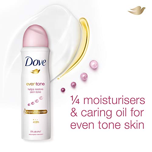New Dove Eventone Deodorant gives you Even toned skin and 48 hr odour protection. Your underarm skin is delicate. Regular Shaving can damage your underarms thus causing dark marks. New Dove Eventone Deodorant is enriched with 1/4th Moisturising Cream & Natural Caring Oil that visibly reduces the signs of damage to your underarm skin thus reducing dark marks to give you Even toned skin. Dove Deo gives you 48 hours of long-lasting sweat & odour protection. This|| combined with its Sweet Floral scent|| keeps you feeling fresh & clean for longer. Whatâs more? Dove Deoâs 0% Alcohol and Paraben-free formula gives you effective protection while being skin friendly. For best results|| use your antiperspirant deodorant spray daily after showering|| when your skin is dry and cool. Shake the Deodorant Can well|| hold it upright & 15cm away from your underarms and spray directly on your underarm skin. Thatâs it|| you are now ready to go! Add Dove Eventone Deodorant to your daily routine for happier underarms. Also explore the rest of the Dove Deodorants range & pick from Dove Original Deodorant spray|| Dove Original Roll-on & Dove Eventone Roll-on. *OLD New Dove Eventone Deodorant Roll-on gives you Even toned skin and 48 hr odour protection. Your underarm skin is delicate. Regular Shaving can damage your underarms thus causing dark marks. New Dove Eventone Deodorant Roll-on is enriched with 1/4th Moisturising Cream & Natural Caring Oil that visibly reduces the signs of damage to your underarm skin thus reducing dark marks to give you Even toned skin. Dove Deo gives you 48 hours of long-lasting sweat & odour protection. This|| combined with its Sweet Floral scent|| keeps you feeling fresh & clean for longer. Whatâs more? Dove Deoâs 0% Alcohol and Paraben-free formula gives you effective protection while being skin friendly. For best results|| use your antiperspirant deodorant roll-on daily after showering|| when your skin is dry and cool. Apply 4 - 6 swipes of Dove Roll-on on underarms post shower. Let the product dry before wearing clothes. Thatâs it|| you are now ready to go! Add Dove Eventone Deodorant Roll-on to your daily routine for happier underarms. Also explore the rest of the Dove Deodorants range & pick from Dove Eventone Deo spray|| Dove Original Deo Spray & Dove Original Roll-on*OLD