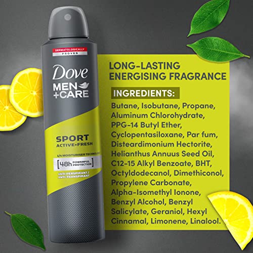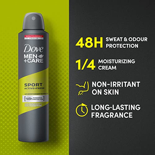 Dove Men+Care Sport Active+ Fresh Dry Spray Antiperspirant Deodorant, Up To 48 hrs Protection From Sweat & Odour, Dermatologically Proven Formula, Soothes & Moisturises Skin, Long-Lasting Refreshing Scent, 250ml