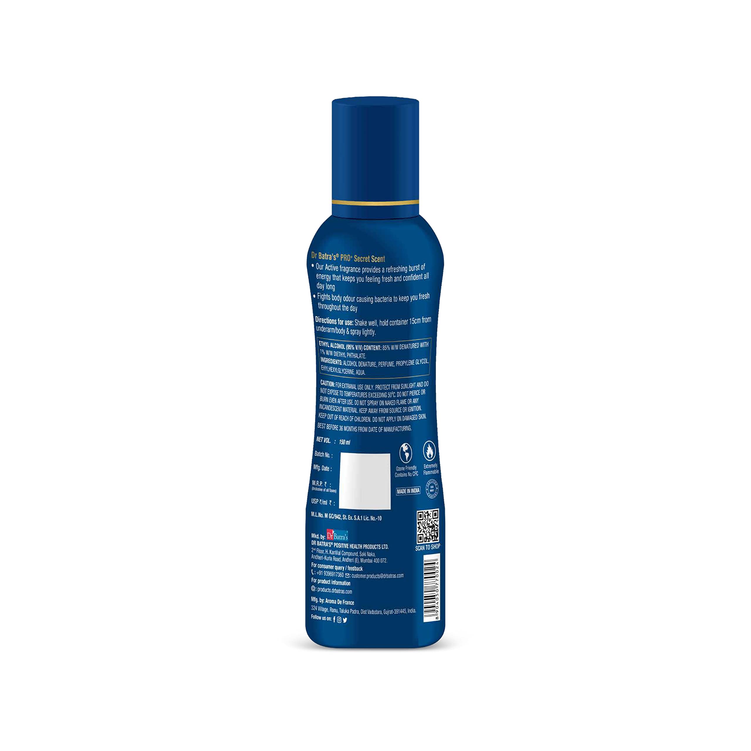 Enchanting Fragrance: Dr Batra's Pro+ Secret Scent Deodorant for Women offers an enchanting fragrance that captivates the senses leaving you feeling confident and refreshed throughout the day. Everyday Use: Designed for everyday use this deodorant is perfect for any occasion whether it's a day at work a casual outing or a special event. Its subtle yet captivating scent adds a touch of elegance to your presence. Long-lasting Freshness: Experience long-lasting freshness with this deodorant's powerful formula. It keeps you feeling fresh and smelling delightful for extended periods ensuring you stay confident and comfortable. Antimicrobial Protection: Dr Batra's Pro+ Secret Scent Deodorant not only offers an irresistible fragrance but also provides antimicrobial protection. It helps combat odour-causing bacteria ensuring you feel fresh and clean throughout the day