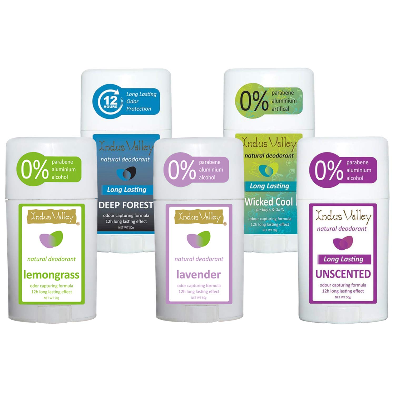INDUS VALLEY Deo Stick Combo || Alcohol Free & Aluminium Free Deodrant Stick For Daily Use(12 Hour Long Lasting Effect) Combo of Unscented Deep Forest Lavender Lemongrass & Wicked Cool 50g*5=250g