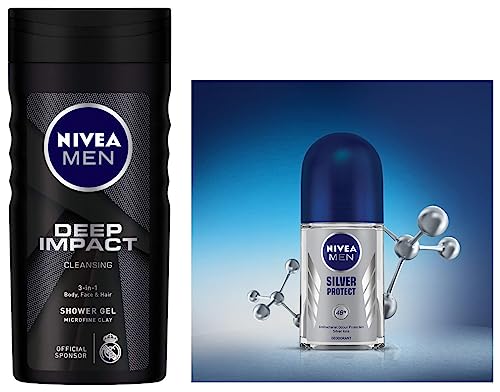Nivea Deodorant Roll On, Silver Protect for Men, 50ml And Shower Gel, Deep Impact Cleansing Body Wash for Men, 250ml
