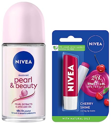 NIVEA Lip Balm, Fruity Cherry Shine, 4.8g & NIVEA Deodorant Roll On, Pearl & Beauty For Women 50ml
