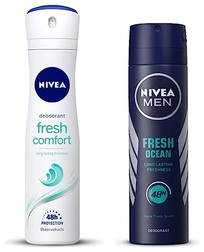 Nivea Fresh Ocean Deodorant for Men 150 mlDive into freshness with the Nivea men fresh ocean deodorant. The Nivea men fresh ocean deodorant with ocean extracts is the solution to get day long ocean freshness. Nivea Fresh Ocean Deodorant for Men gives you long-lasting odour protection. It contains Ocean Extracts for long-lasting freshness Nivea Care Complex to care for your gentle underarm skin and an aqua fresh fragrance to keep you energized all day long. The body spray is dermatologically approved for skin tolerance and should be sprayed directly on the underarm not on clothes or broken/irritated skin. Try out other Nivea deos & roll ons for men to find out your favourite! You can pick different Nivea men deos and roll ons for freshness odour control and care for your underarms. Use it as part of a refreshing routine. Start with Nivea Power Refresh Shower Gel then apply the Nivea Dark Spot Reduction Creme and follow it up with Nivea Fresh Ocean Deo for menNIVEA Women Deodorant Fresh Comfort Long Lasting Freshness & 48h Protection 150 mlNivea fresh comfort deodorant for women contains anti-microbial agents that help keep bacteria away thus giving long lasting odour control. It contains ocean extracts and a clean scent that keep you fresh all day long.