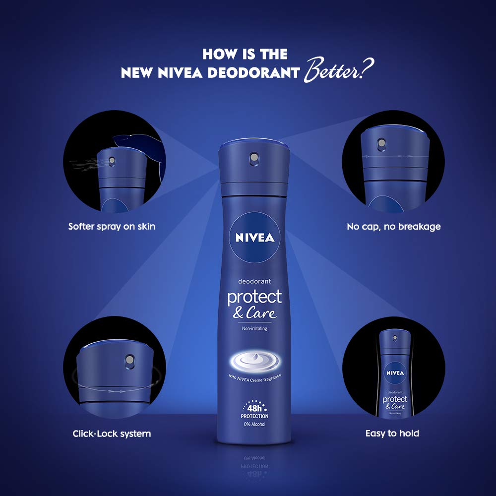 NIVEA Roll-on Deodorant Protect and Care 50mlNIVEA MALE PROTECT & CARE ROLL ON 50MLNIVEA Deodorant Protect and Care 150mlNIVEA Protect & Care is the only deodorant with precious ingredients and fragrance of NIVEA Creme. It protects against body odour & cares for your delicate underarm skin. Skin compatability dermatologically proven.