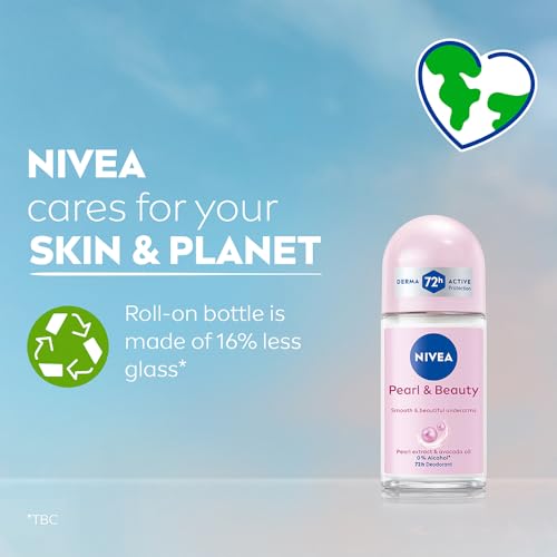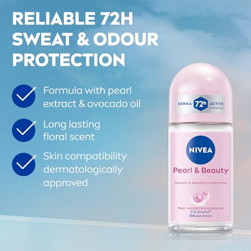 NIVEA Pearl and Beauty 50ml Deo Roll On | With Pearl Extracts & Avocado Oil| 72 H Smooth & Beautiful Underarms | 0% Alcohol | For Women