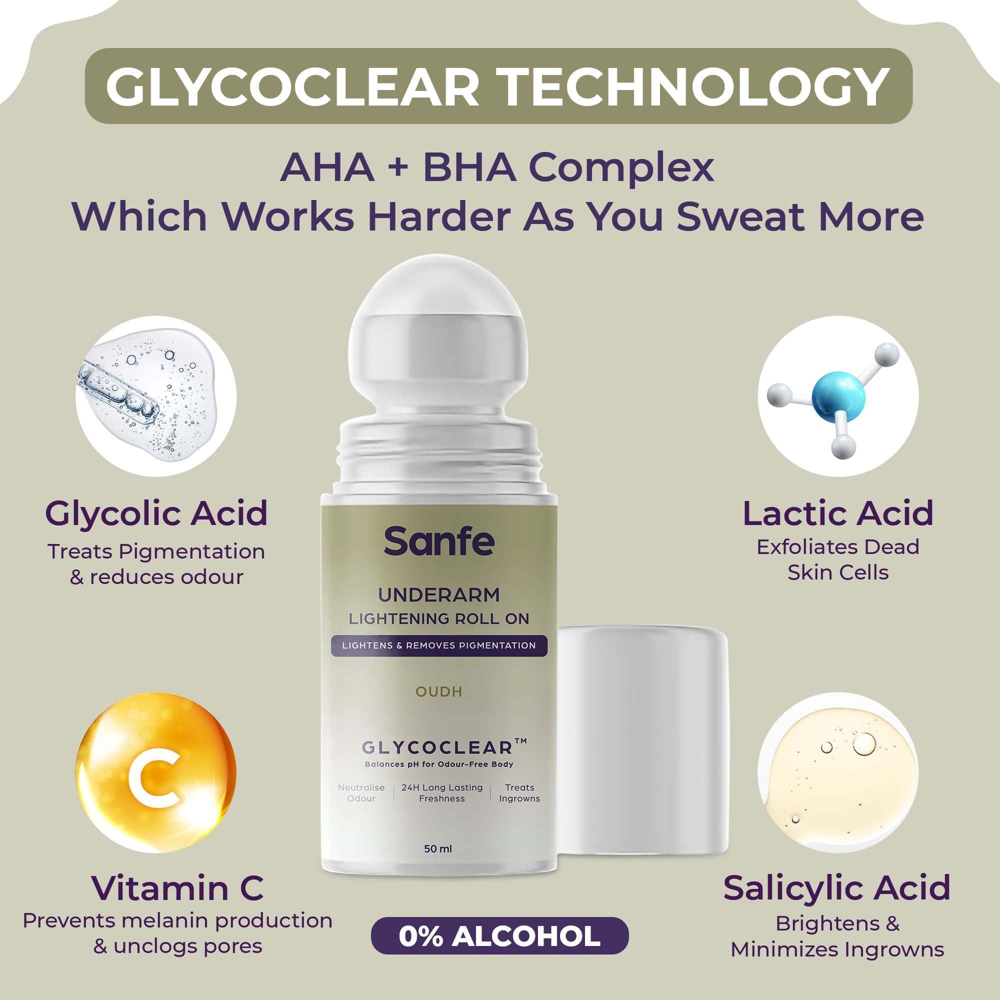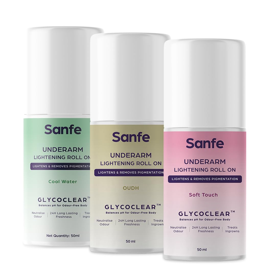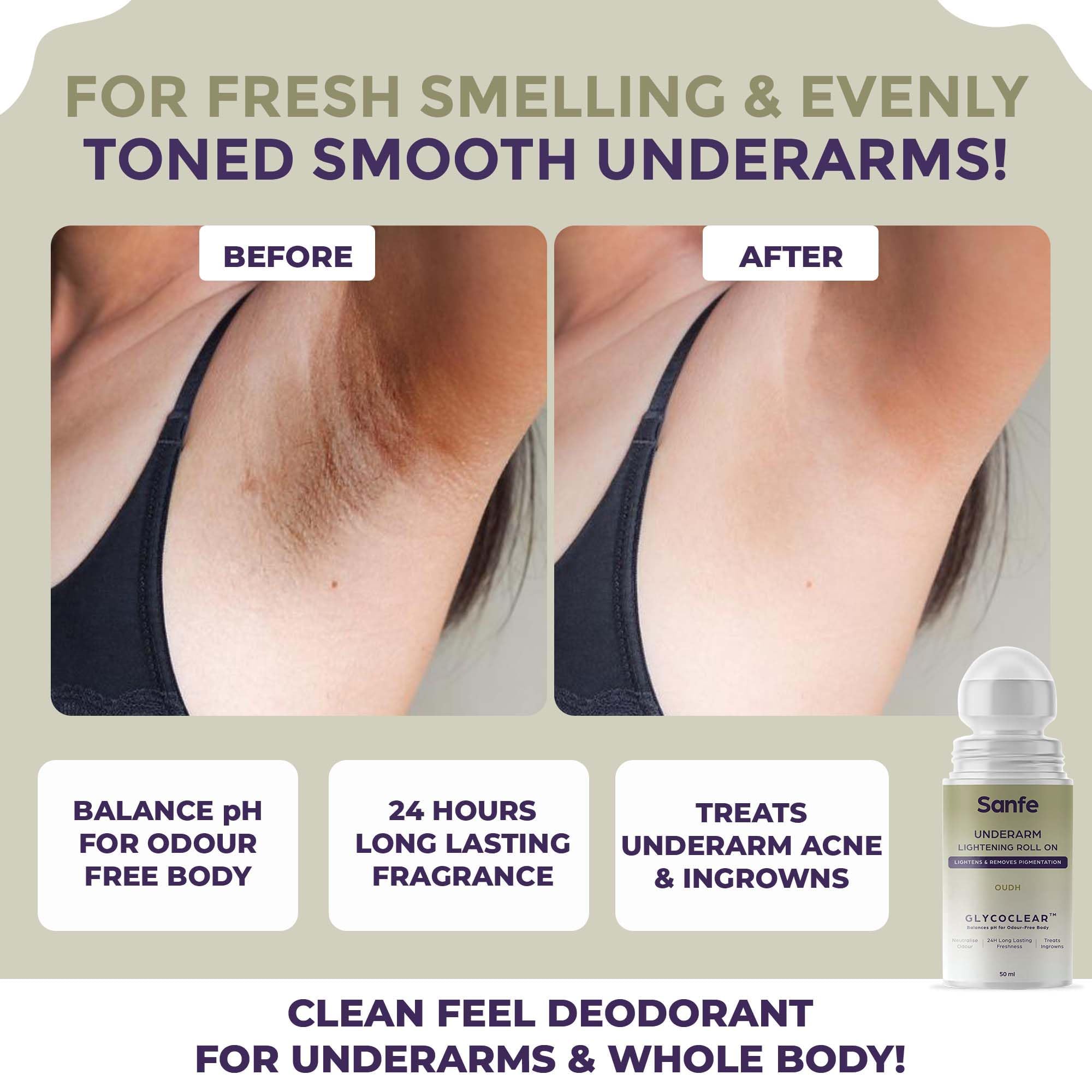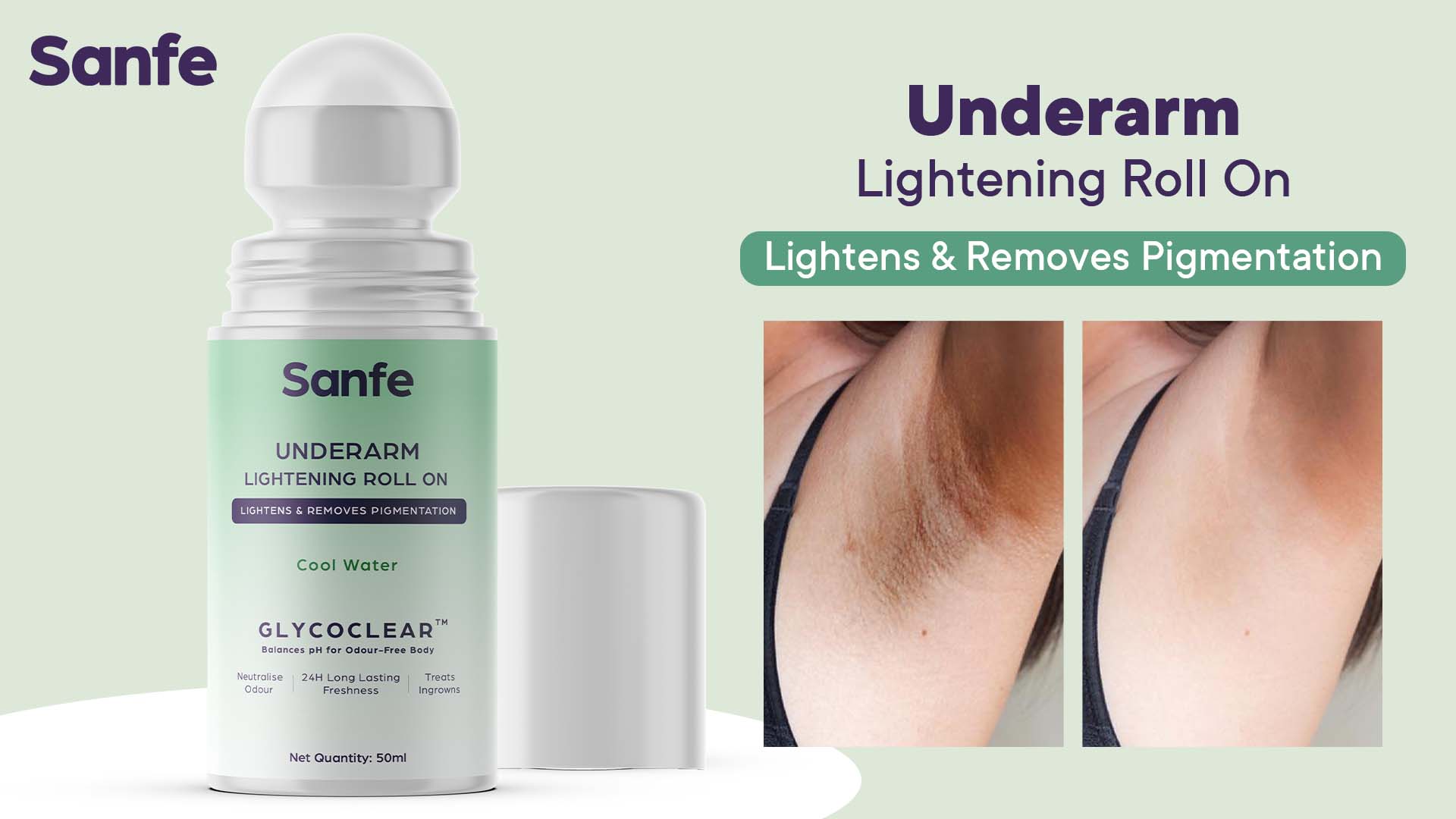 Introducing Sanfe Underarm Lightening Roll On for women this underarm deodorant ultimate solution for flawless underarms and body folds.This innovative deo roll-on lightens pigmentation roll-on lightens pigmentation powered by Glycoclear Technology. It neutralizes odor-causing bacteria for all-day freshness.With 24-hour protection against sweat and odor it treats ingrown hairs too.Say goodbye to dark underarms and hello to brighter smoother confidence.Embrace flawless underarms with Sanfe Lightening Roll On and enjoy a new level of care