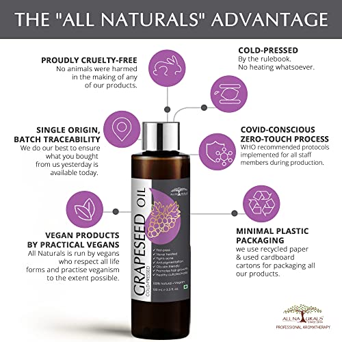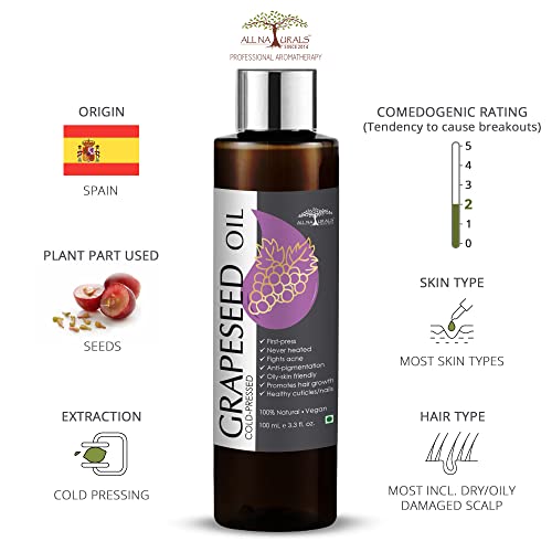 ACNE & OILY-SKIN EXPERT: With its extremely low comedogenic index value of 1 Grapeseed Oil is known to work very well on oily and acne-prone skin. In fact continuous use of this oil helps to balance the oil content in the skin gradually reducing chances of recurrence of acne. 2 drops Tea Tree 1 drop each of Rosemary & Lavender in a tablespoon for Grapeseed make for a great anti-acne recipe. INSTANT GLOW FACE OIL: Need instant glow & moisturization look no further. Grapeseed Oil is an excellent moisturizer and can easily replace your expensive lotions and creams to give you an instant glow (not oiliness). Add 2 drops helichrysum and 1 drop neroli essential oil to a tablespoon of Grapeseed and apply 3-4 times a week to get a never before glow and reduced pigmentation in just a few applications. ALL ROUNDER FACE BODY & HAIR OIL: High values of Linoleic & Oleic Acids make Grapeseed oil great notjust for your face but also the rest of the body and hair. It makes lips nails elbows knees super soft and nourishes the scalp to reduce dandruff & itchiness and support hair growth. Did you know a few drops of grapeseed oil on a cotton pad work as a perfect make-up remover. Add 4 drops Rosemary Oil in Grapeseed to tighten JUDGING AUTHENTIC GRAPESEED OIL: Important to note is the color and odor of the grapeseed oil. The color should be slightly yellow with a greenish tinge. Darker than yellow color means higher citrus pulp content which leads to a stronger odor chances of quick rancidity and lower potency. A very slight fruity odor is a marker for a good quality grapeseed oil. COLOR CONSISTENCY ODOR: All Naturals Grapeseed Oil is the right color & consistency and is almost odorless due to the highly advanced pitting process to remove the maximum amount of pulp without involving any heat giving it a longer shelf life of two years. NET CONTENTS: 30 mLCOUNTRY OF ORIGIN: Spain