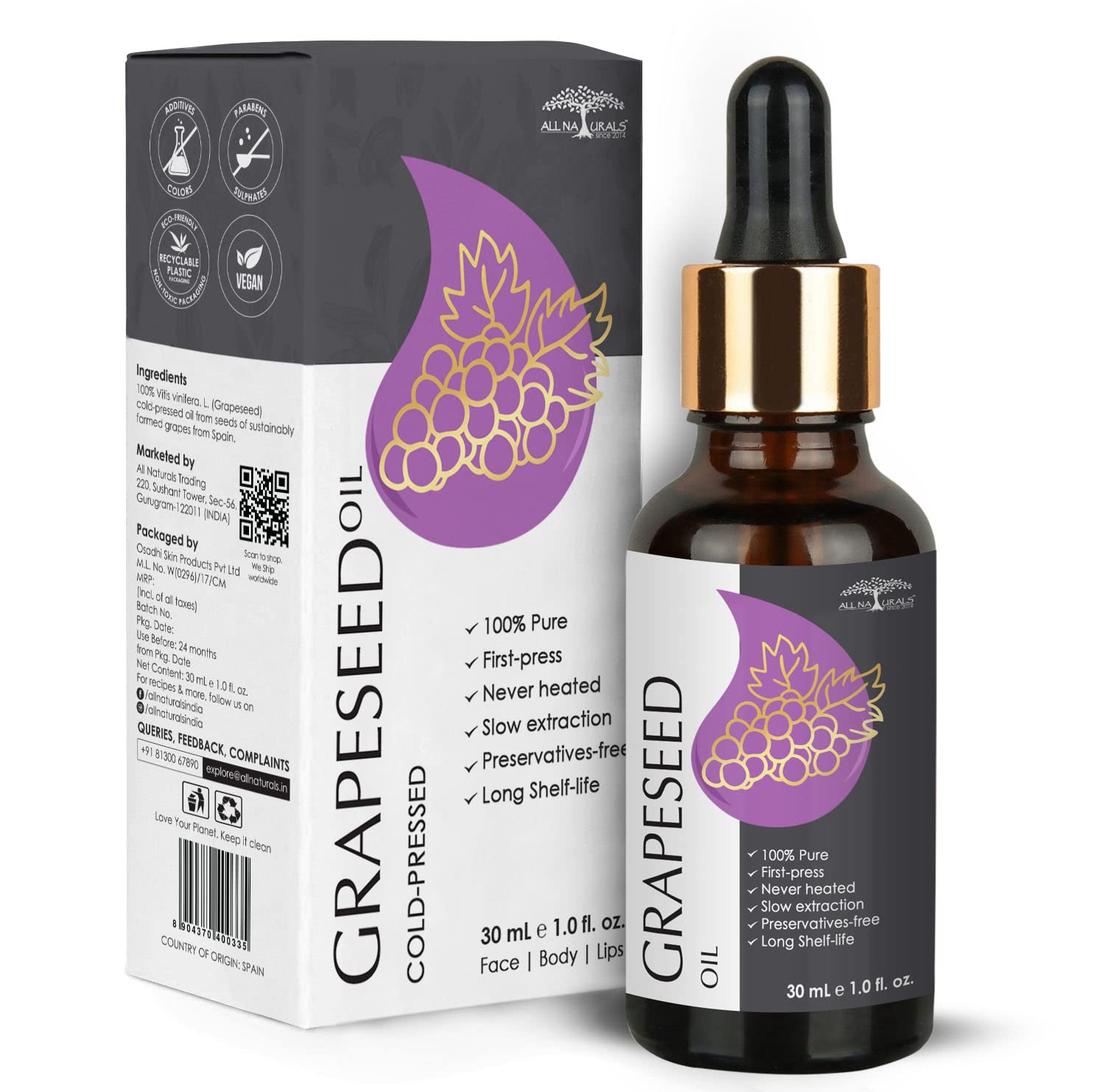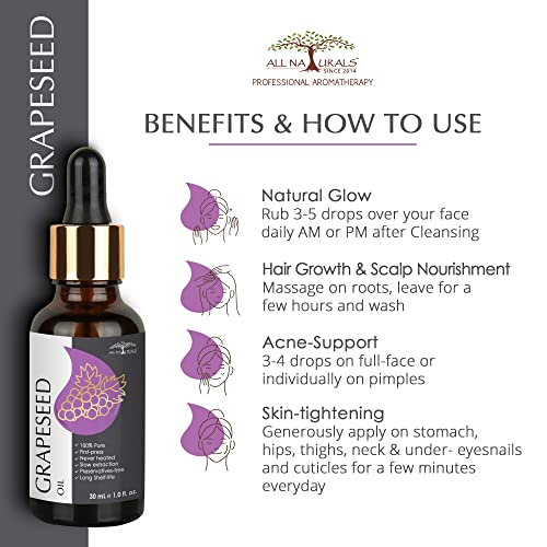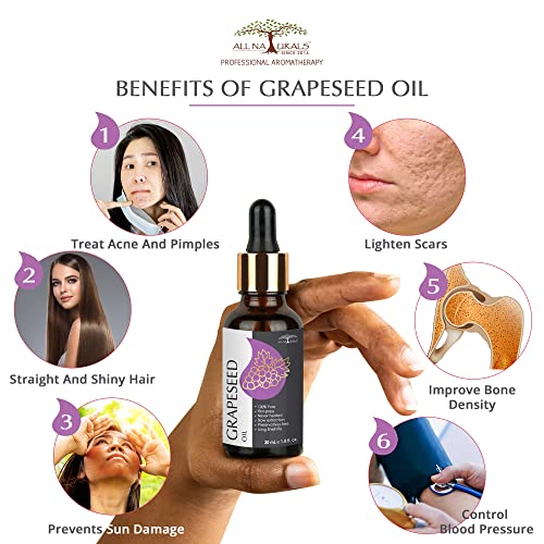 ACNE & OILY-SKIN EXPERT: With its extremely low comedogenic index value of 1 Grapeseed Oil is known to work very well on oily and acne-prone skin. In fact continuous use of this oil helps to balance the oil content in the skin gradually reducing chances of recurrence of acne. 2 drops Tea Tree 1 drop each of Rosemary & Lavender in a tablespoon for Grapeseed make for a great anti-acne recipe. INSTANT GLOW FACE OIL: Need instant glow & moisturization look no further. Grapeseed Oil is an excellent moisturizer and can easily replace your expensive lotions and creams to give you an instant glow (not oiliness). Add 2 drops helichrysum and 1 drop neroli essential oil to a tablespoon of Grapeseed and apply 3-4 times a week to get a never before glow and reduced pigmentation in just a few applications. ALL ROUNDER FACE BODY & HAIR OIL: High values of Linoleic & Oleic Acids make Grapeseed oil great notjust for your face but also the rest of the body and hair. It makes lips nails elbows knees super soft and nourishes the scalp to reduce dandruff & itchiness and support hair growth. Did you know a few drops of grapeseed oil on a cotton pad work as a perfect make-up remover. Add 4 drops Rosemary Oil in Grapeseed to tighten JUDGING AUTHENTIC GRAPESEED OIL: Important to note is the color and odor of the grapeseed oil. The color should be slightly yellow with a greenish tinge. Darker than yellow color means higher citrus pulp content which leads to a stronger odor chances of quick rancidity and lower potency. A very slight fruity odor is a marker for a good quality grapeseed oil. COLOR CONSISTENCY ODOR: All Naturals Grapeseed Oil is the right color & consistency and is almost odorless due to the highly advanced pitting process to remove the maximum amount of pulp without involving any heat giving it a longer shelf life of two years. NET CONTENTS: 30 mLCOUNTRY OF ORIGIN: Spain