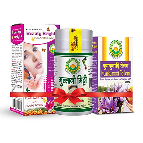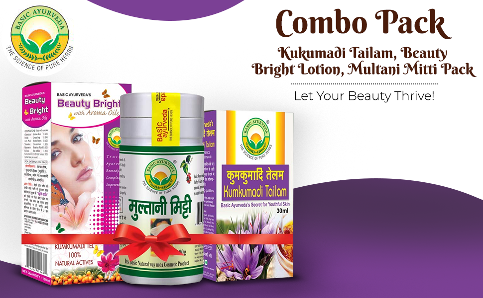 • Basic Ayurveda Beauty combo pack kit it comes with Kumkumadi Tailam (Oil) 12ml Beauty Bright Lotion Cream Multani Mitti Pack 100g Quantity : ( 1 x kumkumadi tailam ) ( 1 x Multani Mitti ) ( 1 x Beauty Bright Lotion Cream )