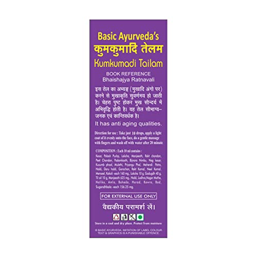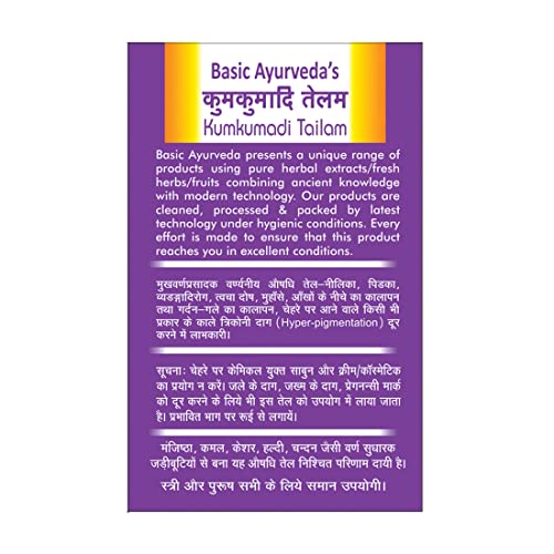 • Basic Ayurveda Kumkumadi Tail is an Ayurvedic herbal oil helpful for face massage. It is helpful to Helpful in improving skin texture complexion and also to relieve skin problems etc.