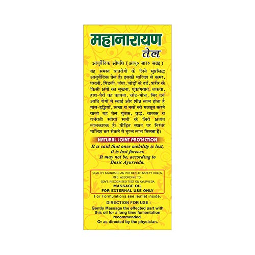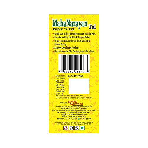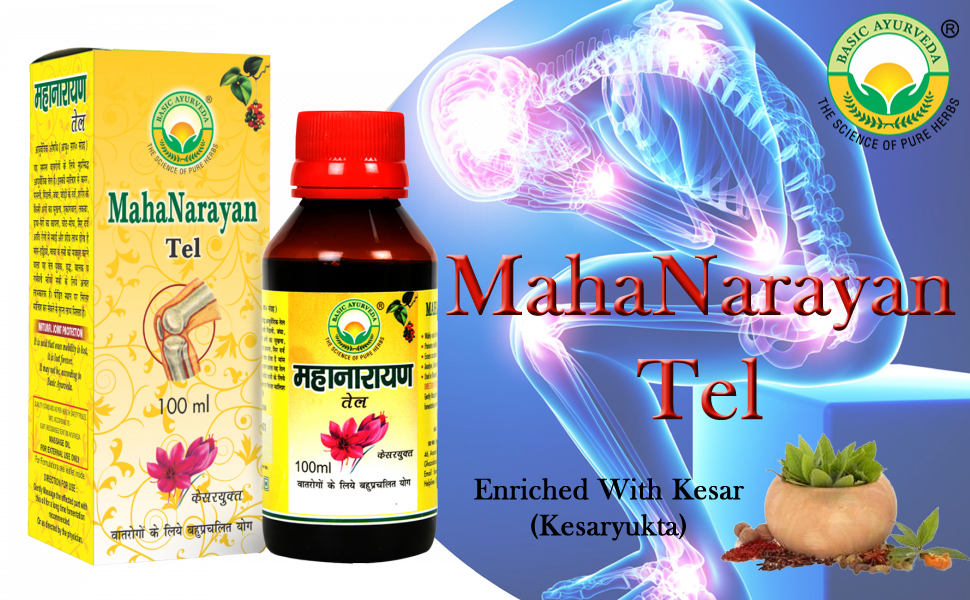 • Basic Ayurveda Mahanarayan Tel is made up of an authentic ayurvedic mixture containing rare and precious Himalayan plant extracts. It may help therapy improves blood circulation especially in the targeted areas where there might be stiffness inflammation