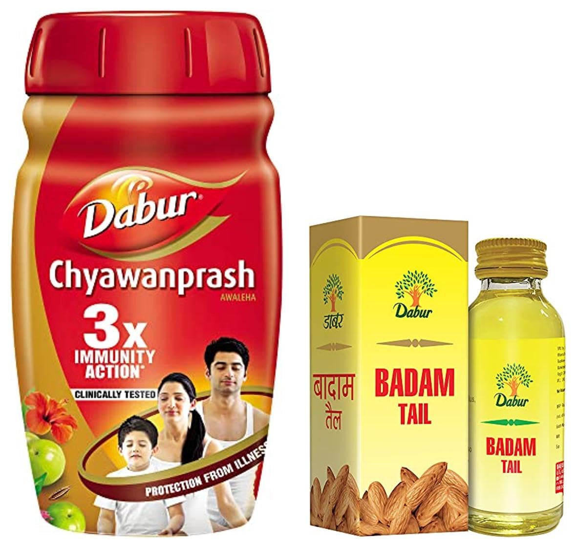 Dabur Badam Tail : Sweet Almond Oil | Rich in Vitamin -E for Healthy Skin Hair and Body - 100mlDabur Badam Oil is obtained from ripe kernels of Prunus Amygdalus. Dabur Badam Oil is extracted from best quality almonds. The oil sharpens brain & strengthens nerves besides improving body strength. It is also acts as a mild laxative which helps to provide aid against constipation in a natural way. Almond oil also contains vitamin E which helps in making your skin soft & glowing. Regular application of Dabur Badam Oil on the scalp makes hair strong & healthy. BENEFITS OF ALMOND FOR SKIN: 1)Moisturizing better and deeper Improving the complexion and retaining the glow 2)Soothing skin irritation and skin inflammation 3)Relieving dry and irritated skin Nourishing skin making it softer and smoother 4)Curing chapped lips and body rashesDabur Chyawanprash 950gm 2X/3X Immunity helps build Strength and for StaminaDo you think your child has inner strength? Do you worry that your child will fall ill? Do you feel that your child may miss school due to falling ill? Do you doubt that only good food is not enough for your child's good health? If your answer to any of the above questions is yes then Dabur Chyawanprash is the answer to your child's health worries - A recipe used in Ayurveda since ancient timeschyawanprash offers a wide range of health benefits. Dabur Chyawanprash provides strong immunity and good digestion for children and adults alike. Two spoons daily of Dabur Chyawanprash supports immunity and is beneficial for overall health and well-being. It is also good for the digestive and respiratory systems. The primary action of Dabur Chyawanprash is to bolster the immune system and to support the body's natural ability to fight illnesses . Amalaki (the main ingredient) aids in the elimination of ama (toxins). Therefore regular use of Dabur Chyawanprash helps strengthen body's natural defence systems. It builds the essence of immunity promoting systemic health and well-being. ingredients of Dabur Chyawanprash are scientifically validated for their beneficial effects on health. It is considered one of the best family tonics—suitable for all ages from young children to the elderly. (Children above 3 years of age).