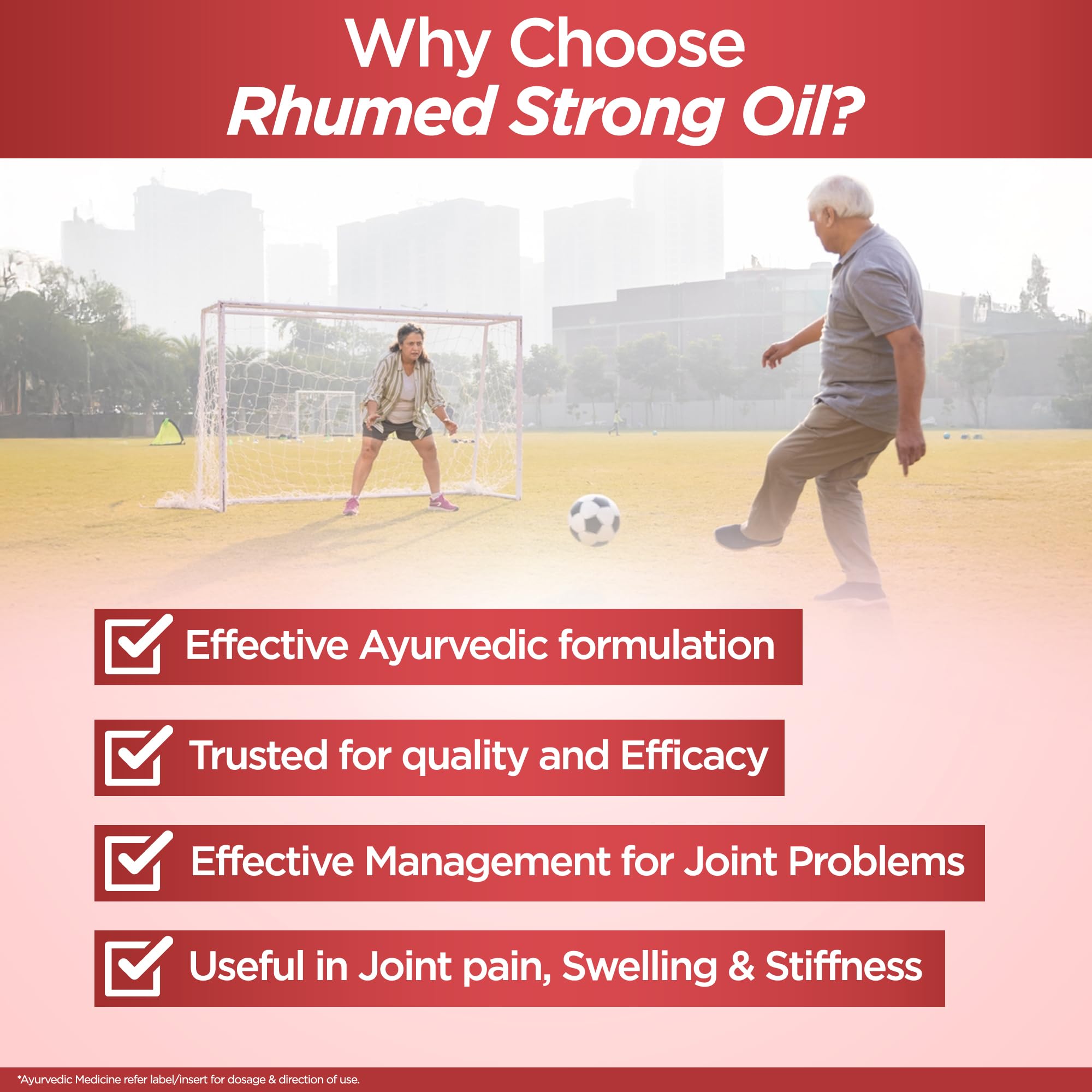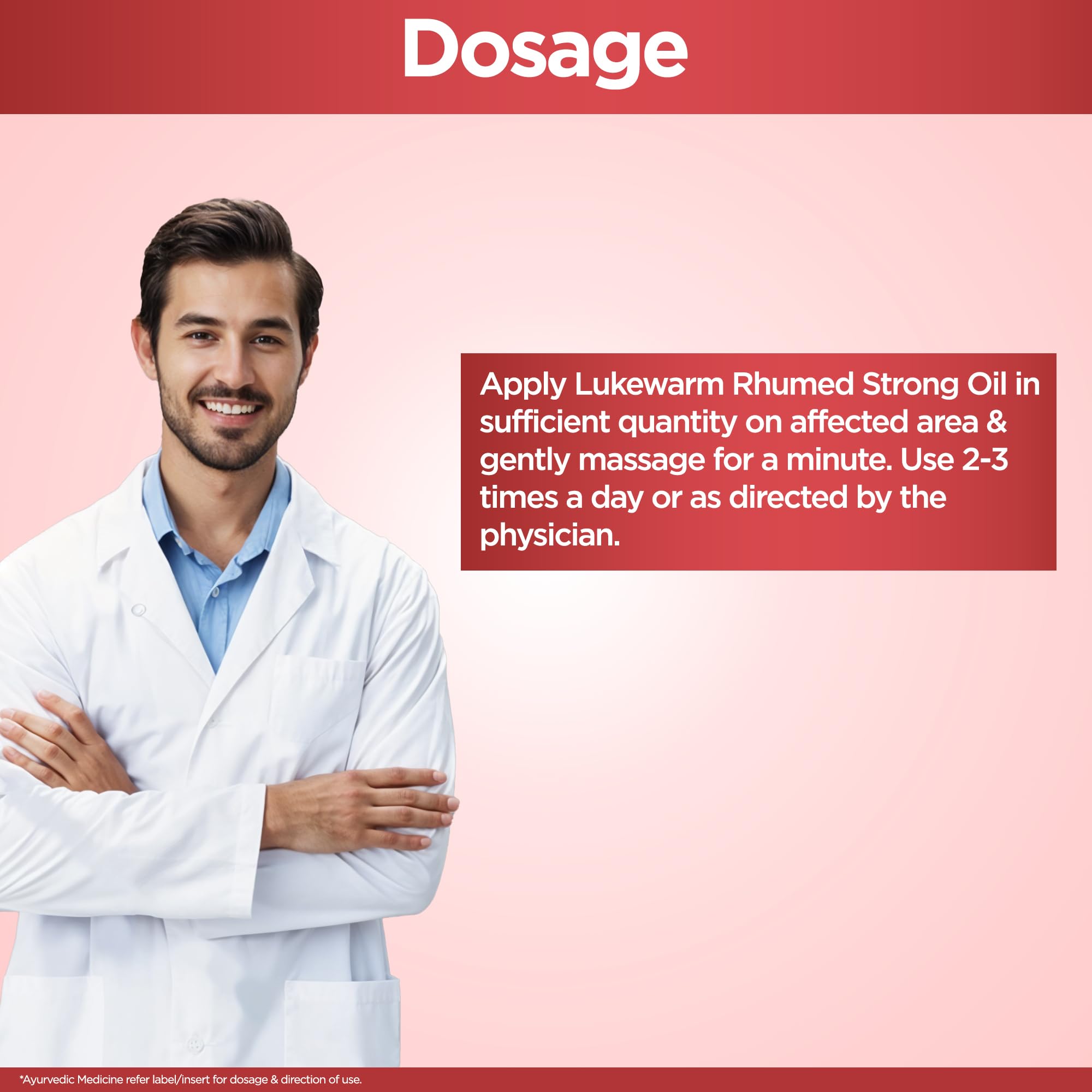 Apply luke warm Rhumed Strong Oil in appropriate quantity on affected area & gently massage for a few minutes 2-3 times a day or as directed by the Physician. For external use only. Not to be used on open wounds or burns.