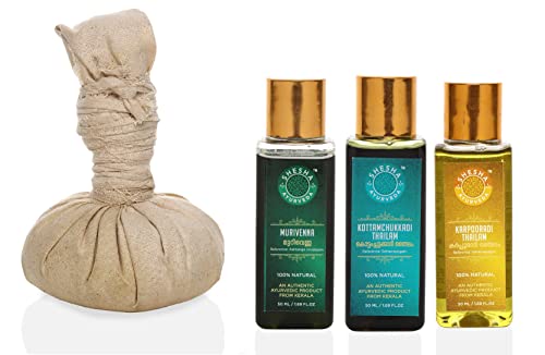 Shesha Ayurveda Pain Relieving & Healing oils kottamchukkadi, Murivenna, karpooradi kit set with Herbal Potli - 50 ML each oil
