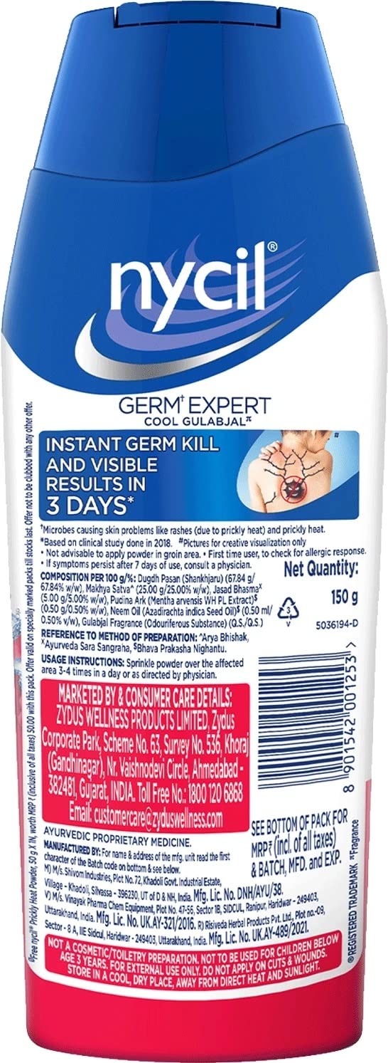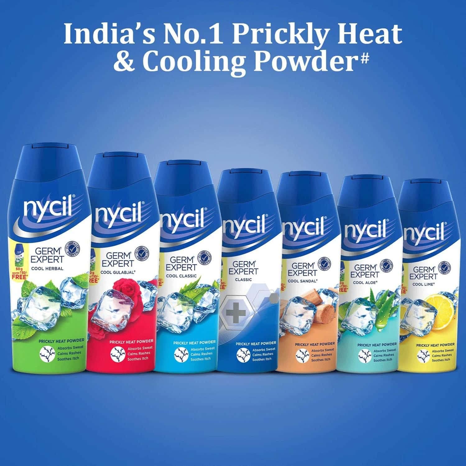 Nycil is one of the sub brands of zydus wellness products Ltd. With the heritage of over 50 years nycil continues to remain as one of the most trusted and #1 brand in prickly heat & cooling powder category in India. The brand has over the years established its efficacy and expertise. Nycil has unique germ*fighter formula which is clinically proven to provide instant germ kill & 3 visible results from summer skin problems such as sweat body odour itching rashes & prickly heat. *Microbes causing skin problems like rashes due to prickly heat and prickly heat prickly heat & cooling powders are used during summers to provide cooling & relief. Regular cooling powders provide only cooling but nycil provides relief against 5 summer skin problems. # 1 Indian brand in prickly heat & cooling powder category for many decades. Clinically proven nycil provides instant germ kill and 3 days visible results from summer skin problems sweat body odour itching rashes & prickly heat. Nycil has unique formula that protects against summer skin problems arising from sweat & germs. Available in 7 variants cool herbal cool gulabjal cool classic cool sandal cool aloe cool lime and classic.