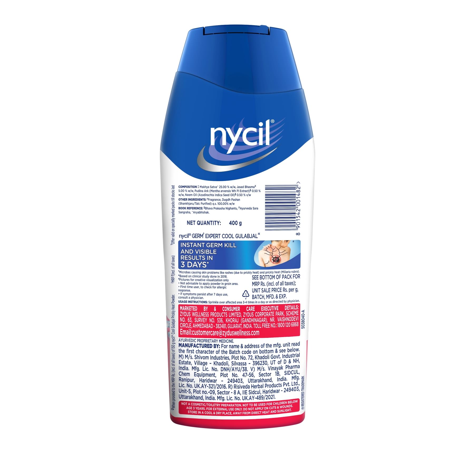 Nycil Germ Expert powder by Zydus Wellness with a heritage of 60+ years is a trusted Indian household brand. It is known to help fight prickly heat skin problems such as rashes and irritated skin caused due to hot and humid weather. Nycil Cool Gulabjal Prickly Heat Talcum Powder is a cooling powder that helps absorb sweat calms rashes and soothes itch. Nycil provides expert germ protection and visible results from prickly heat and other skin problems. It has a soothing fragrance that helps fight body odour arising from sweating. A higher concentration of neem oil gives it antibacterial properties to help fight against skin problems. Explore all the prickly heat variants in talc format viz. - Classic Cool Aloe Cool Classic Cool Herbal Cool Lime and Cool Sandal. It also comes in convenient to use and carry spray format - Nycil Soothing and Refreshing Body Mist