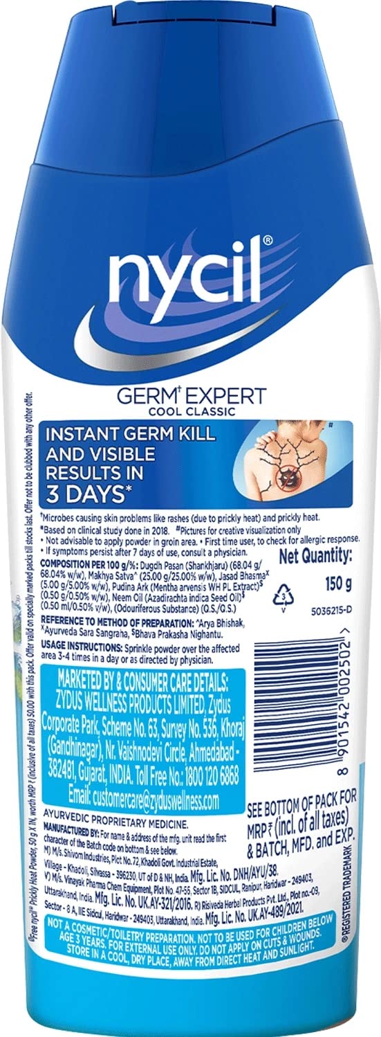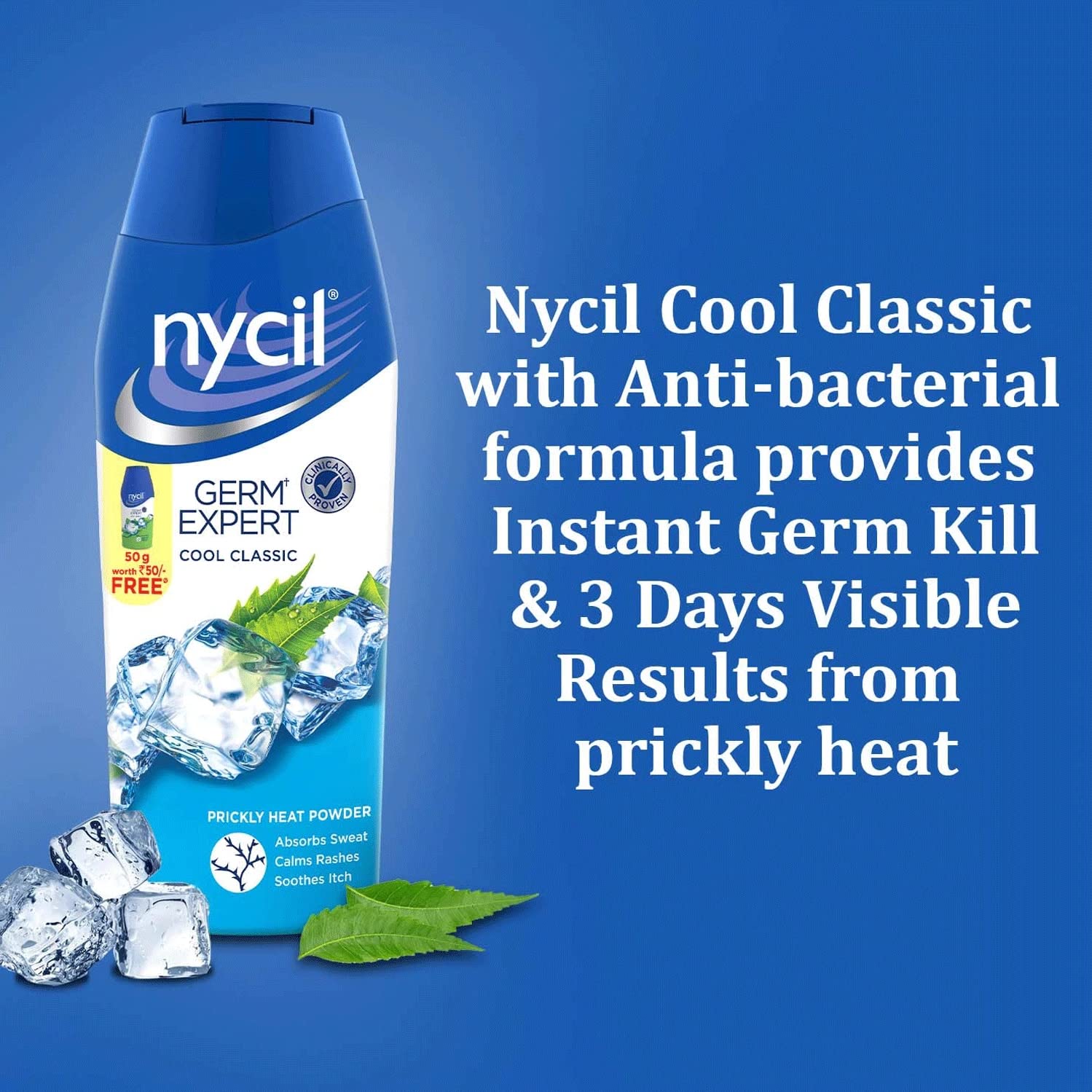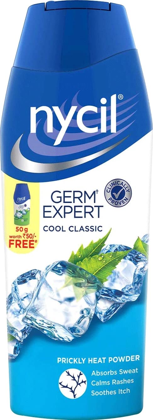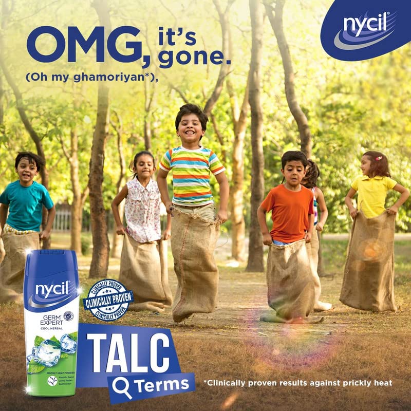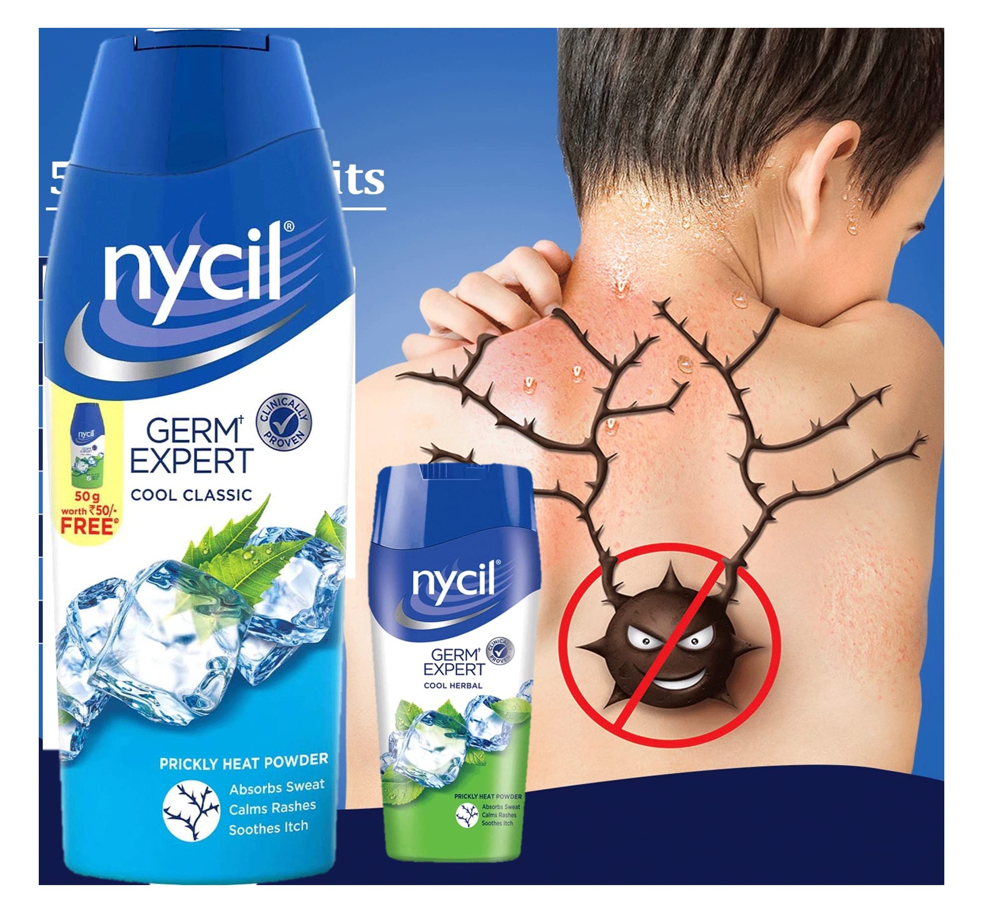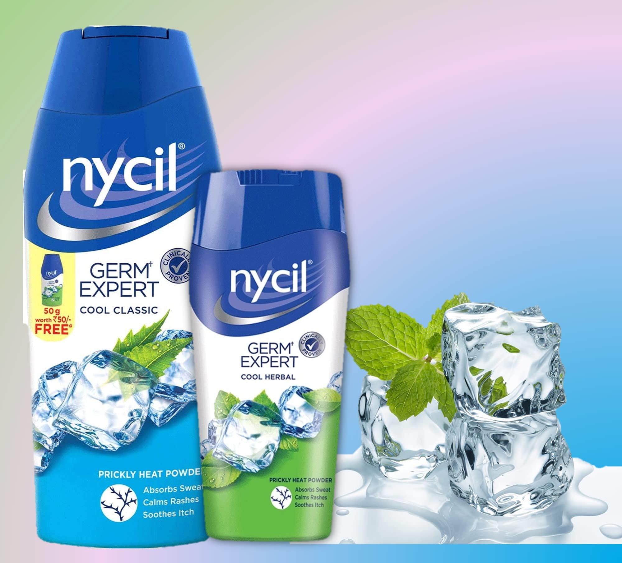 Nycil is one of the sub brands of zydus wellness products Ltd. With the heritage of over 50 years nycil continues to remain as one of the most trusted and #1 brand in prickly heat & cooling powder category in India. The brand has over the years established its efficacy and expertise. Nycil has unique germ*fighter formula which is clinically proven to provide instant germ kill & 3 visible results from summer skin problems such as sweat body odour itching rashes & prickly heat. *Microbes causing skin problems like rashes due to prickly heat and prickly heat prickly heat & cooling powders are used during summers to provide cooling & relief. Regular cooling powders provide only cooling but nycil provides relief against 5 summer skin problems. # 1 Indian brand in prickly heat & cooling powder category for many decades. Clinically proven nycil provides instant germ kill and 3 days visible results from summer skin problems sweat body odour itching rashes & prickly heat. Nycil has unique formula that protects against summer skin problems arising from sweat & germs. Available in 7 variants cool herbal cool gulabjal cool classic cool sandal cool aloe cool lime and classic.