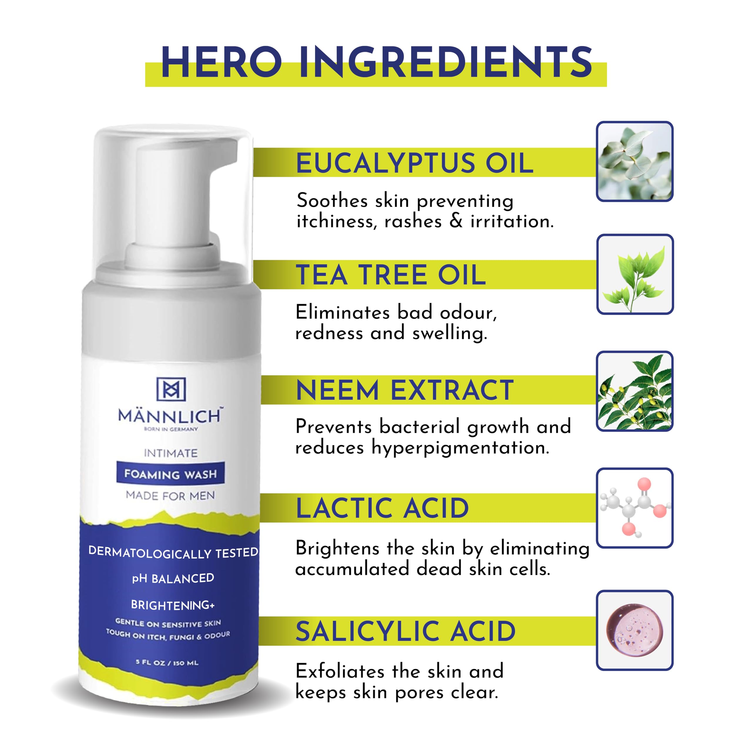 Intimate wash is an important part of men's health. Regular use of soap and body washes can cause itching irritation and dryness making one feel uncomfortable. Mannlich Intimate Foaming Wash is specially curated for your intimate area. It's gentle enough for daily use and helps to preserve the natural acidic pH of the intimate area keeping you clean and hygienic. Daily use of Mannlich Intimate Foaming Wash helps in achieving even skin tone in intimate areas helping to reduce the appearance of discoloration or depigmentation. Pump an adequate amount onto your palm and gently massage the lather on your and leave on for 50 seconds. Rinse thoroughly with clean water. Use while showering daily to get the best result.