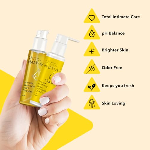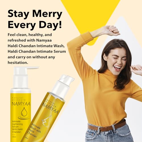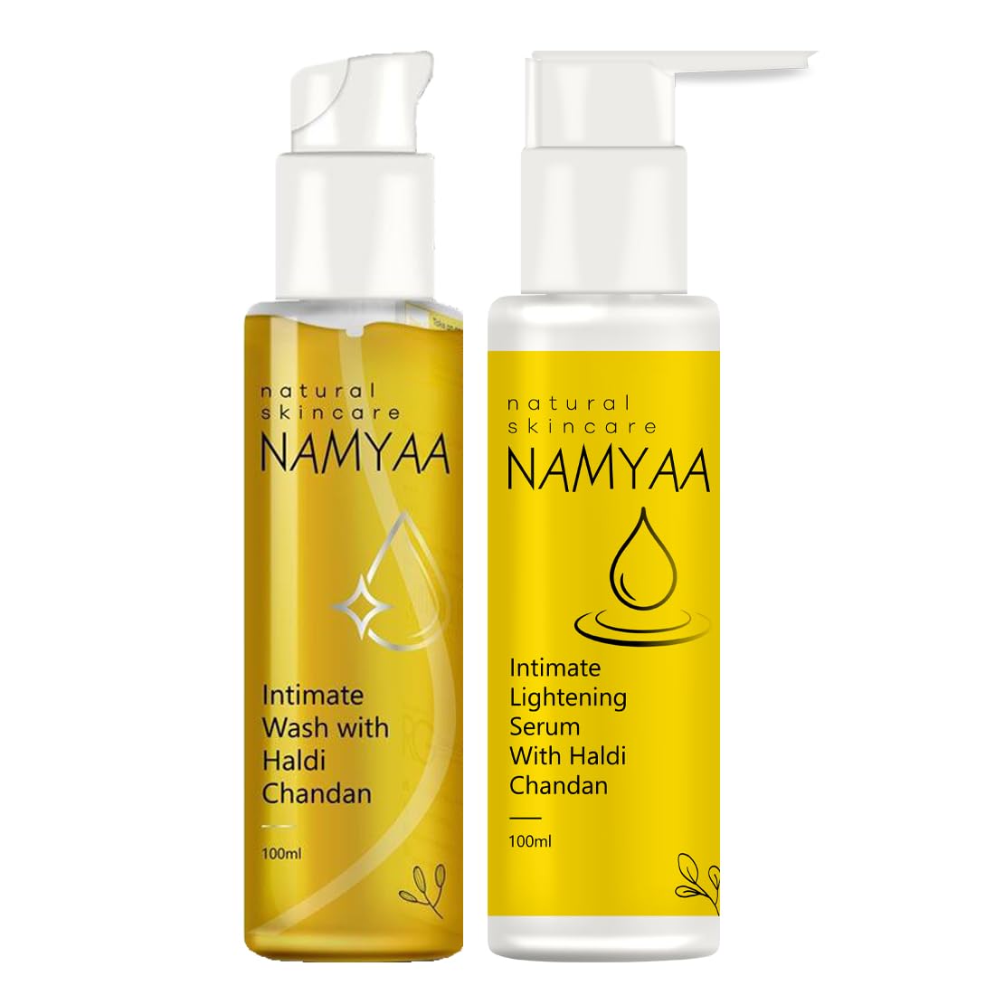 Namaya Intimate Lightening Serum With Haldi And Chandan' comes enriched with the powerful goodness of Haldi and Chandan that is known to help exfoliate the intimate area and inhibit hyper pigmentation lighten spots marks and blemishes in the most effective manner. Help lighten dark and patchy intimate parts and also tighten them in the process. It is free from skin damaging ingredients like chemicals harsh metals strong bleaching agents and hydroquinone. Namyaa Intimate Hygiene Wash With Haldi And Chandan' helps cleanse the intimate area in the most gentle manner and in the endeavour helps lighten your intimate parts in an exceptional manner. Is free from any kind of dangerous chemicals harsh metals hydroquinone pesticides fertilisers and any kind of synthetic or other additives for the matter. Formulated using the traditional techniques and methods of ancient Ayurveda with the goodness of proven Ayurvedic extracts like Haldi Chandan Aloe Barbadensis Leaf Juice etc.