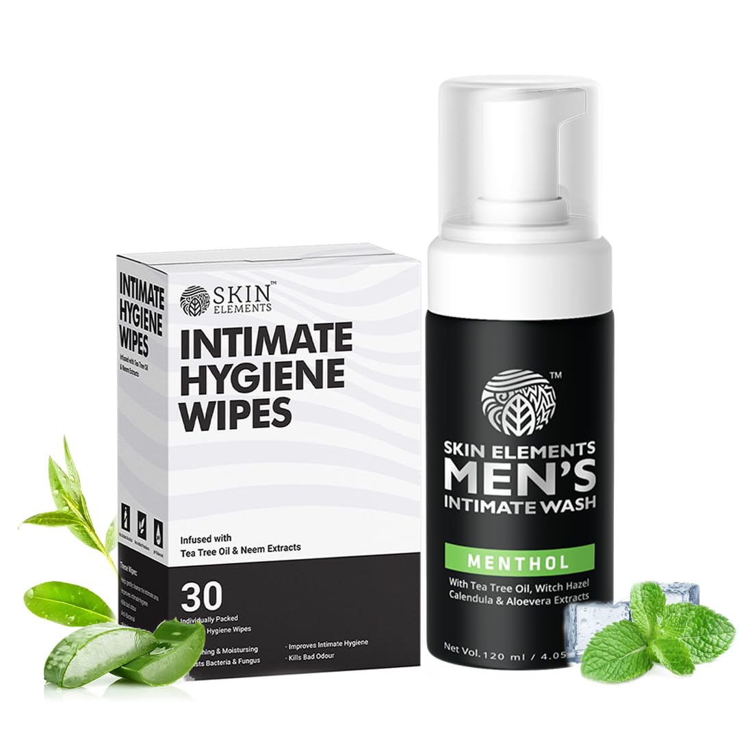 HomeBeautyBodyFeminine HygieneSkin Elements Intimate Hygiene Combo | Intimate Wash Men 120 ml With Menthol + 30 Wipes With Tea Tree & Neem Extracts | Ph Balanced Foaming Wash | Controls Unwanted Odor & Sweat