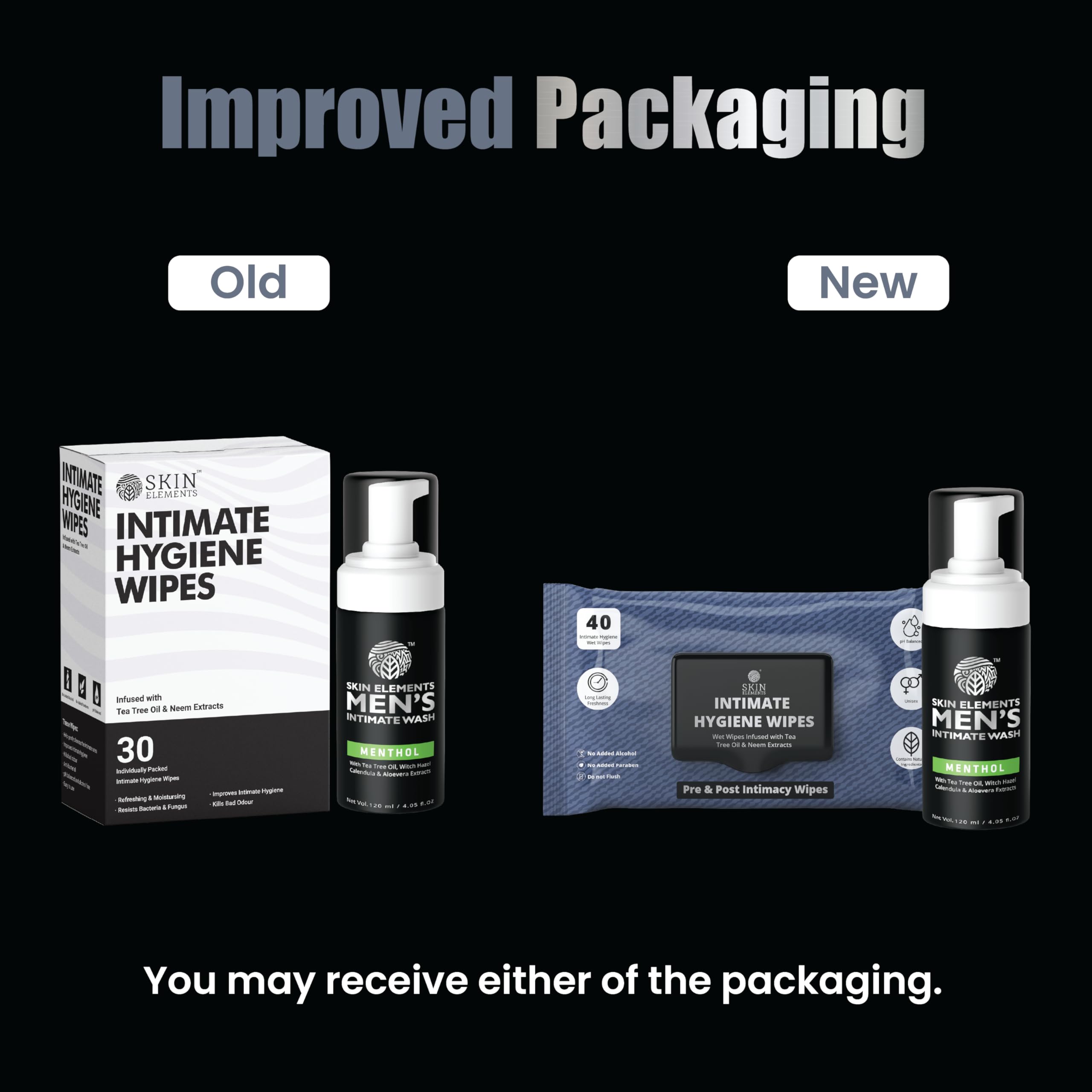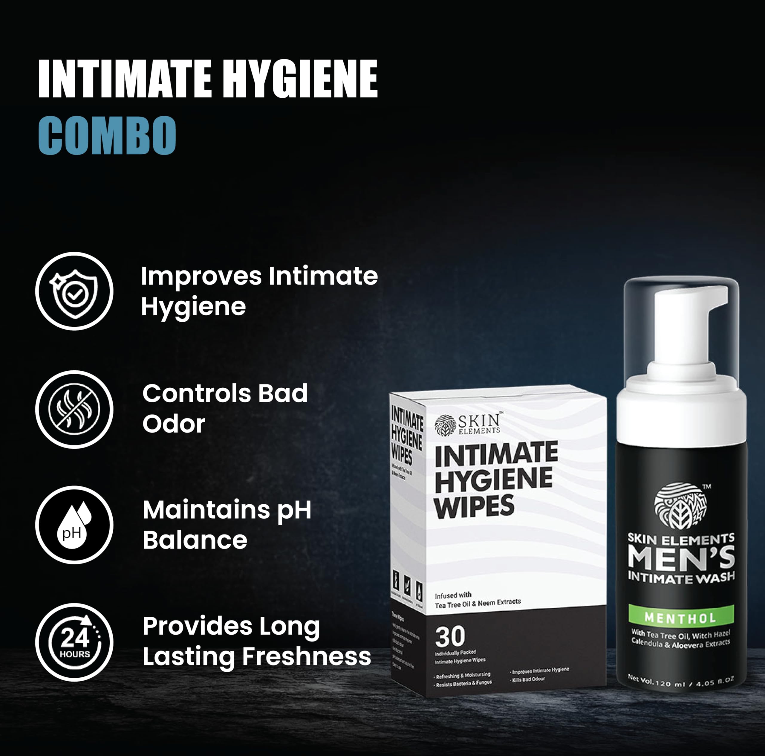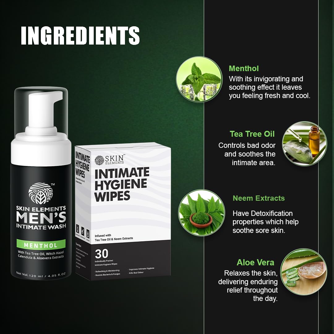 Skin Elements Intimate Hygiene Combo | Intimate Wash Men 120 ml With Menthol + 30 Wipes With Tea Tree & Neem Extracts | Ph Balanced Foaming Wash | Controls Unwanted Odor & Sweat