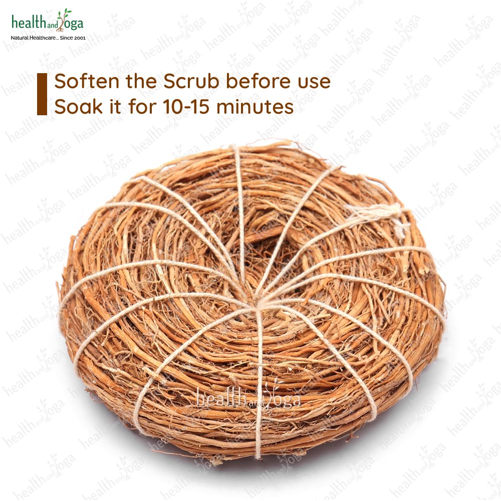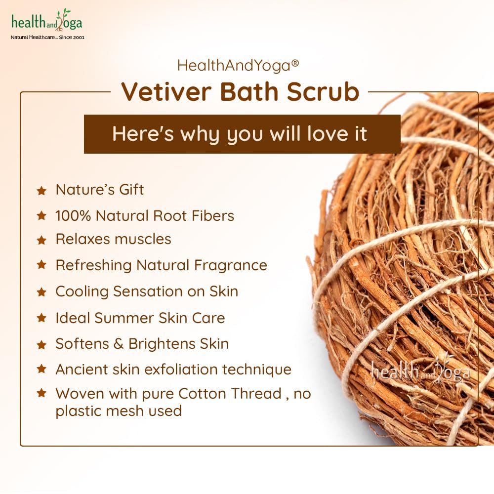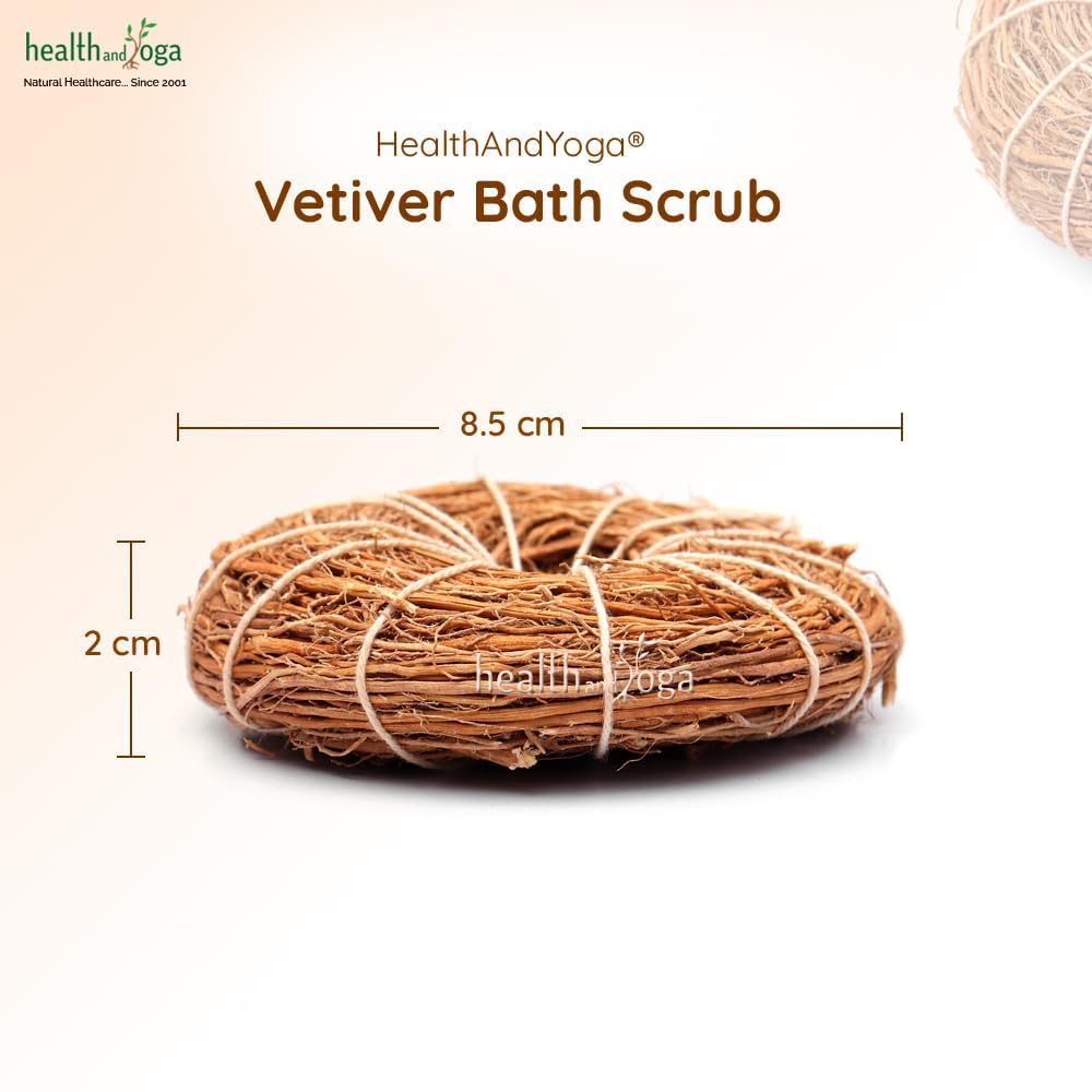 HealthAndYoga Vetiver Bath Scrub has a convenient round shape for a firm grip. It can be used in circular motion for gentle exfoliation. It is made of 100 % natural dried vetiver roots and retains the natural wooden earthy aroma of nature. Since ancient times Vetiver has been in use for daily skincare due to its deodorizing antiseptic and healing properties. HealthAndYoga Vetiver Bath Loofah aids in removal of dead skin cells stretch marks and helps to get a soft smooth and glowing skin. It also helps to cool the skin balance sebaceous glands functioning to normalize oily/dry skin and soothes skin inflammations and allergies. It refreshes the mind and spirit with its natural aroma that helps to connect with Mother Nature. A good body scrub with it helps to overcome stress anxiety and nervousness. It is a far superior alternative to plastic and synthetic bath scrubs that may harm the skin. Makes for a wonderful thoughtful ecofriendly and sustainable health gift for loved ones.