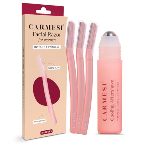 The Carmesi Smooth Shave Essentials combo is your perfect solution for painless and effective facial grooming giving you everything you need for a smooth shave at home. This combo includes 1 Cooling Aftershave Roll-On and 3 Facial Razors designed to make shaving effortless and pain-free. Forget the discomfort of waxing and threadingânow you can remove facial hair in just one stroke with the Facial Razor without any pain or irritation. The razor is gentle on your skin ensuring zero cuts while removing peach fuzz and other unwanted hair. To complete your grooming routine the Cooling Aftershave Roll-On instantly soothes your skin post-shave providing an icy-cool freshness that calms and hydrates irritated skin. Whether you're prepping for a special occasion or simply maintaining smooth flawless skin this kit has got you covered. The convenience of shaving at home paired with the refreshing aftercare of the roll-on makes it an easy anytime anywhere solution. Enjoy smooth skin and say goodbye to painful hair removal methods with this all-in-one combo.