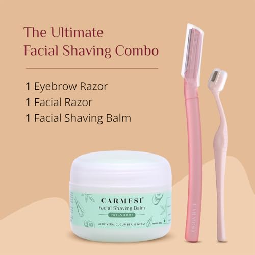 Meet the ultimate facial shaving combo from Carmesi! This combo contains 1 Facial Razor 1 Eyebrow Razor and 1 Facial Shaving Balm which allow you to groom anytime anywhere. The Facial Razor allows you to remove peach fuzz instantly and painlessly. You can also use it to remove hair from your forehead chin and sideburns. The Eyebrow Razor on the other hand allows you to shape your eyebrows to perfection. The Facial Shaving Balm is perfect for pre and post-shave care. Apply it before and after shaving to reduce cuts redness and irritation. With this combo you can enjoy painless grooming. The Facial Razor has a zigzag blade pattern which goes extra-gentle on your skin. Forget razor cuts and painful threading forever. Enjoy a quick one-stroke every time! Further the Facial Razor helps exfoliate your skin making it softer and smoother. The Shaving Balm on the other hand soothes and moisturizes your skin after shaving. It's rich in Aloe Vera and Cucumber which also helps cool your skin.
