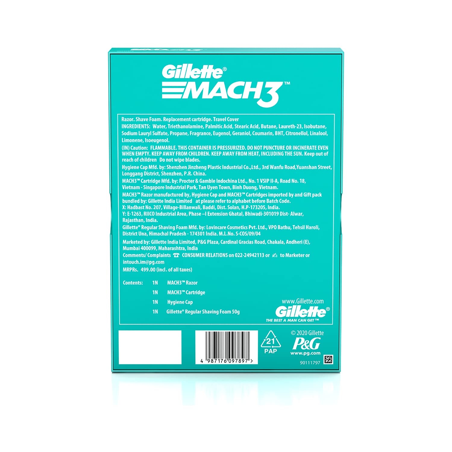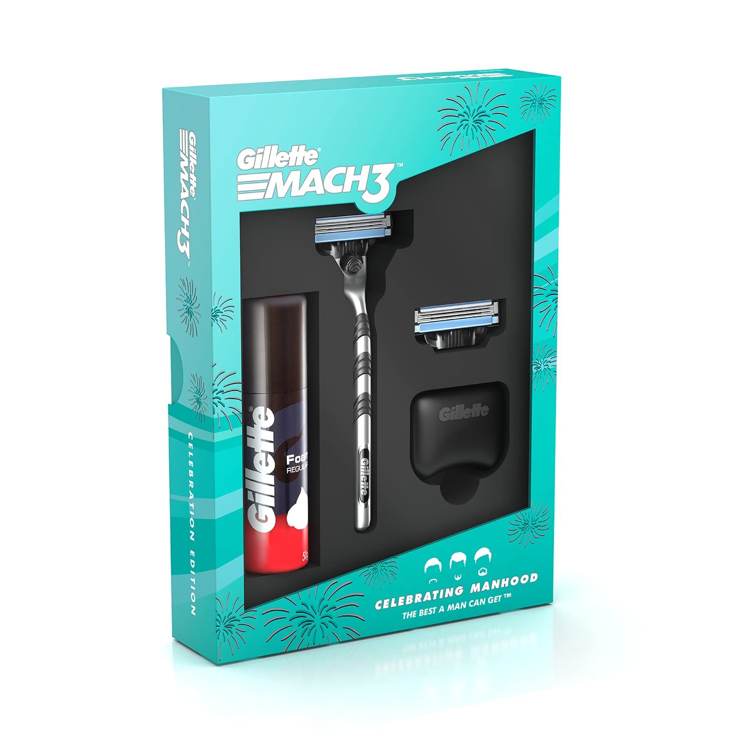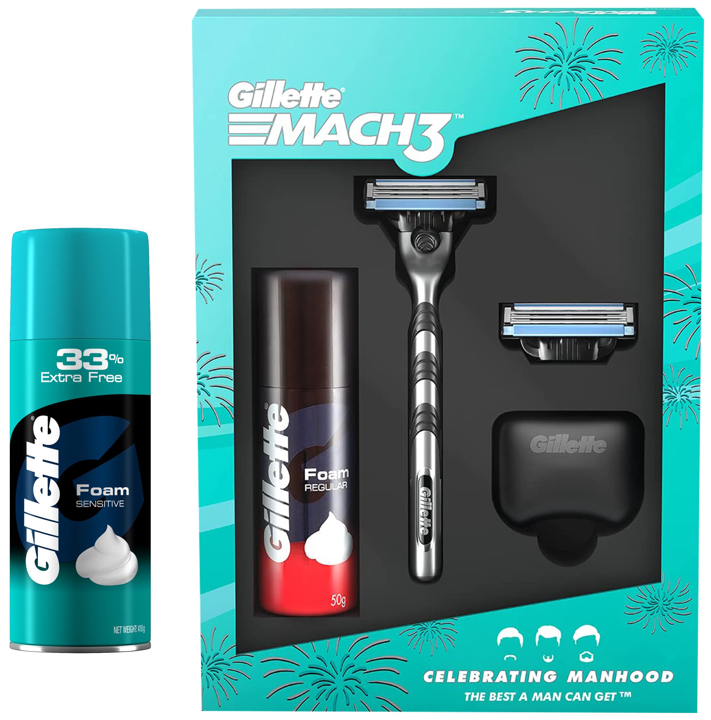 Gillette Classic Sensitive Shave Foam - 418 g (33% extra)Simple.Honest.Classic. That's the Gillette Foam shave. The lightly fragranced for Sensitive Skin lather spreads easily and rinses clean for that Foam shave men have enjoyed for generations.Gillette MACH3 Limited Edition Travel PackMach3 Gift Pack with Travel Bag Mach3's 3 blade technology offers a comfortable shave along with the longevity that comes only with exchangeable blades. Its Comfort Guard includes 5 Microfins to bring you a close comfortable shave while the Indicator Lubrication Strip fades to white to show when you are no longer getting an optimal shave from your razor blade. A highly trusted choice the MACH3 continues to give men around the world a great start to their day.