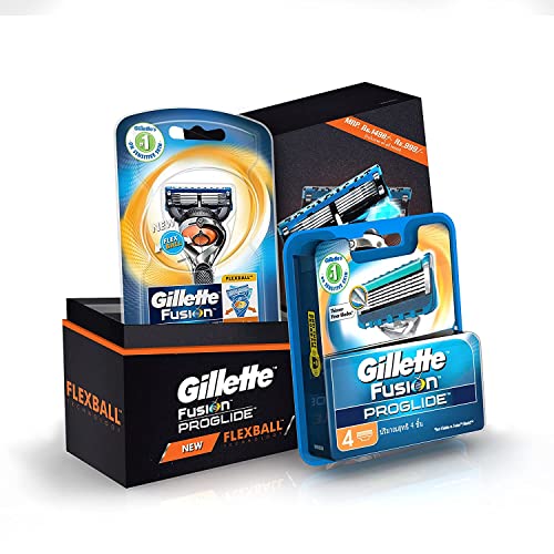 Gillette Flexball Pro Glide Gift Pack and Flexball Razor with 4 Flexball CartridgeThis product is from Gillette brand. It is flexball proglide style razor with proglide 4's cartridge blade pack Unique Flexball movement that hugs every curve on your face ensuring maximum contact.Gillette Fusion Manual Blades for men - 4 count for Perfect Shave and Perfect Beard ShapeGillette Fusion Manual Razor has 5 Blade shaving surface technology spaced closer together for less irritation and more comfort with an ergonomic handle.Precision trimmer (back blade) to own your style. Get perfect beard lines and get barber-like precision at home. an indicator lubra strip that gradually fades to white when you're no longer getting an optimal shave. So you always know when to change the blade.