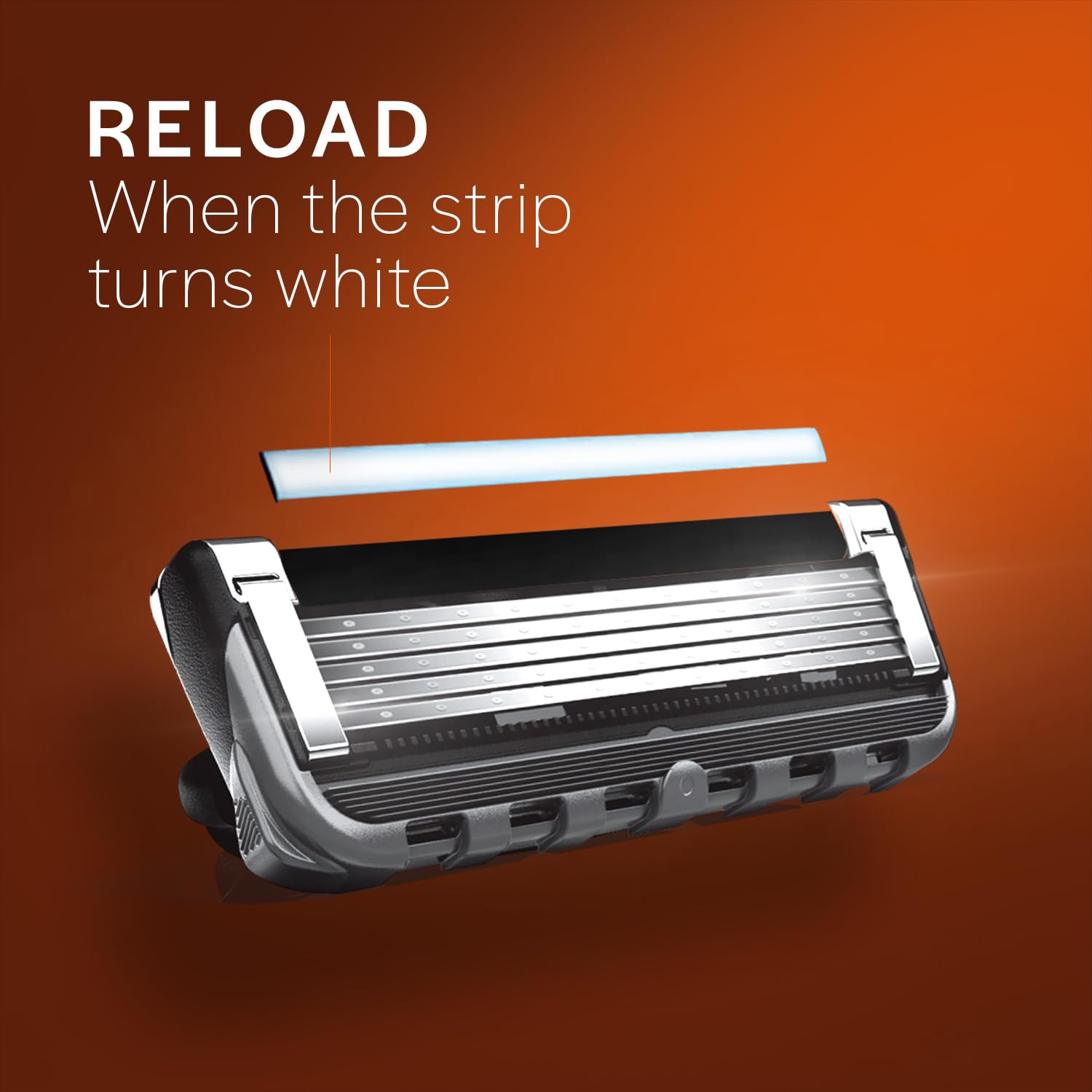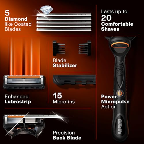 Fusion Power takes comfort technology to a new level. It has independently sprung blades that adjust to your face and helps the razor easily cut through hair. It has oscillating motor that delivers soothing micro pulses which help reduce friction and increase razor glide. A flexible comfort guard that follows the contours of your face and pulls your skin taut for a comfortably close shave. A Precision trimmer technology on the back of the cartridge that shapes all types of beard styles and an indicator lubra strip that gradually fades to white when you're no longer getting an optimal shave. So you always know when to change the blade.
