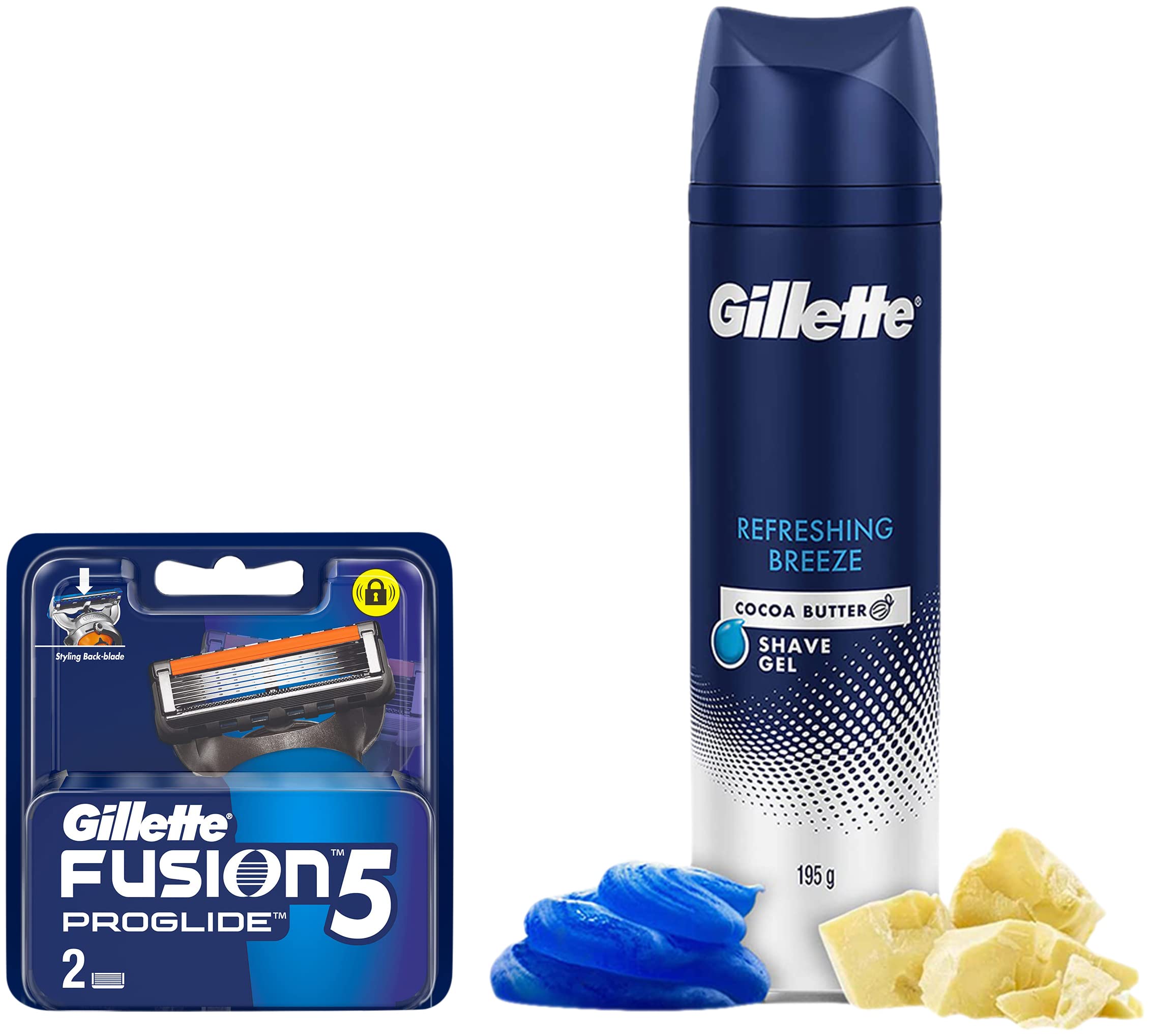 Gillette Fusion Proglide Blades for men - 2 count for Perfect Shave and Perfect Beard ShapeMost men who shave regularly complain of missed hairs and that too in the highly contoured areas of the face. That's because while razor pivots usually offer two-dimensional movement our faces are essentially three-dimensional. Hence all the pulling and stretching to make flat surfaces where there isn't one. Introducing the Gillette Fusion ProGlide Razor with FLEXBALL Technology a new era of shaving technology developed with over 5 years of research and extensive trials with volunteers across the globe. The FLEXBALL Technology allows the blades to pivot front to back as well as from side to side (up to 24 degrees). This ensures that the full width of the cartridge gets to be more evenly in contact with your jawline getting virtually every hair. And with the pivot in motion more than 80% of the time it relieves your wrist elbow and shoulder joints of the extra pressure. In other words the razor puts in all the effort so you don't have to. And what you wake up to every morning is the most precise closest and effortless shave. It also has a Precision trimmer technology on the back of the cartridge that shapes all types of beard styles and an indicator lubra strip that gradually fades to white when you're no longer getting an optimal shave. So you always know when to change the blade.Gillette Shaving Gel Refreshing Breeze with Cocoa Butter 195 ml WhiteGillette Refreshing Breeze with cocoa butter has an enriched moisturizng formula and the Triple Protection formula that helps protect your skin against nicks redness and tightness. It enhances razor glide for a smooth and comfortable shave. Gillette with its rich composition and perfect consistency is the best way to make shaving easy and pleasant. Superbly-selected ingredients leave skin smooth soft to the touch and well groomed.