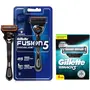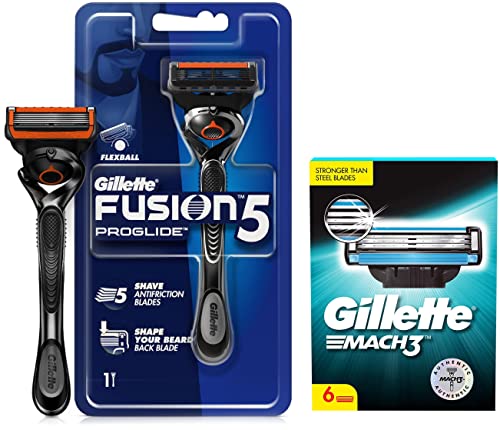 Gillette Mach 3 Shaving Blades- Pack of 6 (Cartridges)Gillette mach3 men's razor blade refills feature stronger-than-steel blades that stay sharper longer. With sharper blades it is engineered to last for 15 comfortable shaves. These Gillette razors feature a lubrication strip that glides to help protect your skin from redness and a micro fin skin guard that stretches the skin and prepares hair to be cut. Mach3 men's razor blade refills fit all mach3 razors. Gillette mach3 gives a better shave than a new 2-bladed ordinary razor even after 5 weeks.Gillette Proglide Men's Grooming Razor with Flexball Technology - Adapts to Facial Contours (1 pc)Introducing Gillette Fusion ProGlide with FlexBall Technology the men's razor that responds to contours for Gillette's ultimate shave. Reengineered Low Cutting Force Blades feature thinner finer edges with advanced low-resistance coating to cut effortlessly through hair with less tug and pull than Fusion. The Gillette Fusion ProGlide brings Gillette's cutting edge shaving technology with a Blade Stabilizer to provide the ultimate shaving experience. The Stabilizer maintains optimal blade spacing for the best comfort while allowing the blades to respond to the contours of a man's face. Its Streamlined Comfort Guard channels excess shaving cream and produces optimal blade contact stretching the skin for a close comfortable shave. Its Enhanced Lubrastrip is infused with mineral oil and lubricating polymers that allow the Gillette Fusion ProGlide to move smoothly over the skin even on repeat strokes.