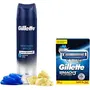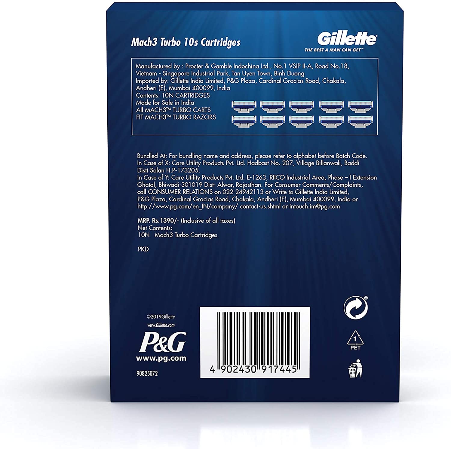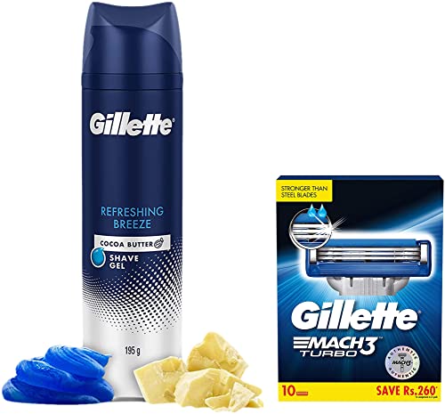 Gillette Mach Turbo 3 Shaving Blades- Pack of 10 (Cartridges)The three blades of the Gillette mach3 turbo are treated with an advanced anti-friction coating allowing the mach3 turbo to remove each hair with less feel of irritation. Soft protective micro fins gently smooth down the skin allowing the mach3 turbo to shave evenly and effortlessly. The indicator lubrication strip helps ensure that your mach3 turbo razor blade keeps gliding across your skin shave after shave.Gillette Shaving Gel Refreshing Breeze with Cocoa Butter 195 ml WhiteGillette Refreshing Breeze with cocoa butter has an enriched moisturizng formula and the Triple Protection formula that helps protect your skin against nicks redness and tightness. It enhances razor glide for a smooth and comfortable shave. Gillette with its rich composition and perfect consistency is the best way to make shaving easy and pleasant. Superbly-selected ingredients leave skin smooth soft to the touch and well groomed.
