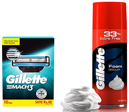 Gillette Mach3 Shaving 3-Bladed Cartridges Pack of 10Gillette mach3 men's razor blade refills feature stronger-than-steel blades that stay sharper longer. With sharper blades it is engineered to last for 15 comfortable shaves. These Gillette razors feature a lubrication strip that glides to help protect your skin from redness and a micro fin skin guard that stretches the skin and prepares hair to be cut. Mach3 men's razor blade refills fit all mach3 razors. Gillette mach3 gives a better shave than a new 2-bladed ordinary razor even after 5 weeks.Gillette Classic Regular Pre Shave Foam 418g with 33% Extra FreeGillette Classic Regular Pre Shave Foam 418g with 33% Extra Free Fatty Foam by Procter and Gamble Comfort Glide Formula