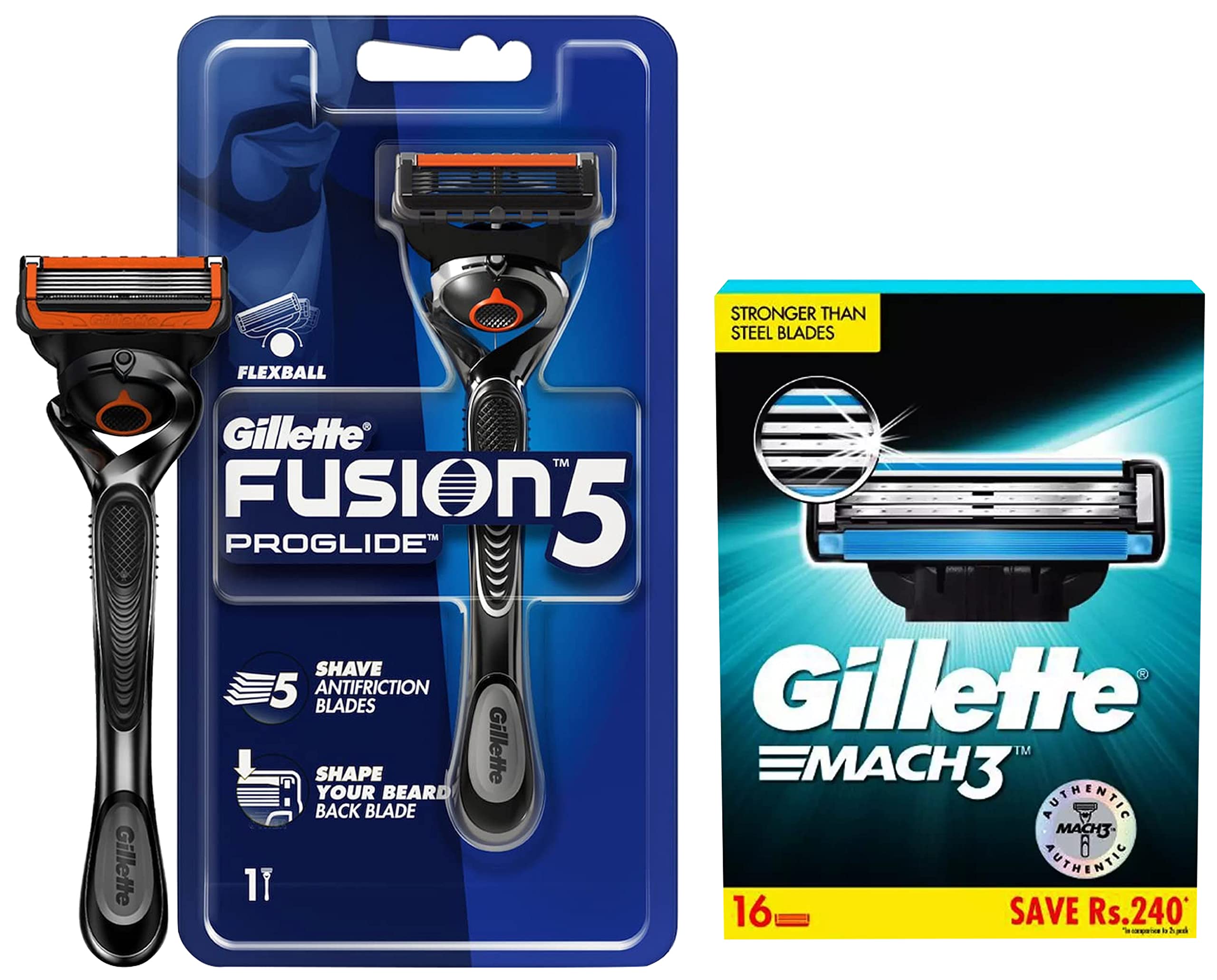 Gillette Mach3 Shaving 3-Bladed Cartridges Pack of 16Gillette mach3 men's razor blade refills feature stronger-than-steel blades that stay sharper longer. With sharper blades it is engineered to last for 15 comfortable shaves. These Gillette razors feature a lubrication strip that glides to help protect your skin from redness and a micro fin skin guard that stretches the skin and prepares hair to be cut. Mach3 men's razor blade refills fit all mach3 razors. Gillette mach3 gives a better shave than a new 2-bladed ordinary razor even after 5 weeks.Gillette Flexball Pro Glide Gift Pack and Flexball Razor with 4 Flexball CartridgeThis product is from Gillette brand. It is flexball proglide style razor with proglide 4's cartridge blade pack Unique Flexball movement that hugs every curve on your face ensuring maximum contact.