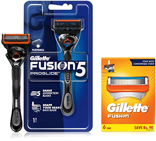 Gillette Proglide Men's Grooming Razor with Flexball Technology - Adapts to Facial Contours (1 pc)Introducing Gillette Fusion ProGlide with FlexBall Technology the men's razor that responds to contours for Gillette's ultimate shave. Reengineered Low Cutting Force Blades feature thinner finer edges with advanced low-resistance coating to cut effortlessly through hair with less tug and pull than Fusion. The Gillette Fusion ProGlide brings Gillette's cutting edge shaving technology with a Blade Stabilizer to provide the ultimate shaving experience. The Stabilizer maintains optimal blade spacing for the best comfort while allowing the blades to respond to the contours of a man's face. Its Streamlined Comfort Guard channels excess shaving cream and produces optimal blade contact stretching the skin for a close comfortable shave. Its Enhanced Lubrastrip is infused with mineral oil and lubricating polymers that allow the Gillette Fusion ProGlide to move smoothly over the skin even on repeat strokes.Gillette Fusion Shaving Blades- Pack of 6 (Cartridges)Gillette fusion offers every man whether clean-shaven or with facial hair a great way to shave. Gillette fusion features a 5-blade shaving surface technology on the front of the shaving cartridge. The blades are spaced 30 percent closer together than the mach3 razor family. This creates a shaving surface that distributes the shaving force across the blades for significantly less irritation and more comfort. Includes a lubrastrip which fades from green to white signalling when shave conditions have been reduced. The precision trimmer blade a single blade built into the back of the cartridge allows men to easily trim sideburns shave under the nose and shape facial hair. That's a great shave.