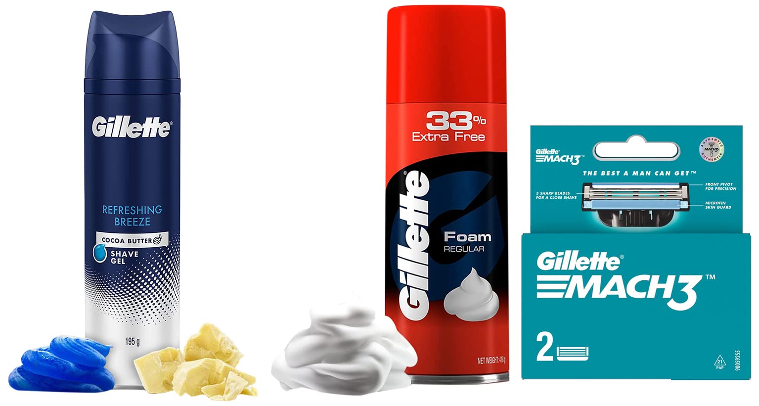 Gillette Shaving Gel Refreshing Breeze with Cocoa Butter 195 ml White & Classic Regular Pre Shave Foam 418g with 33% Extra Free & Mach 3 Manual Shaving Razor Blades - 2s Pack (Cartridge)