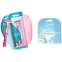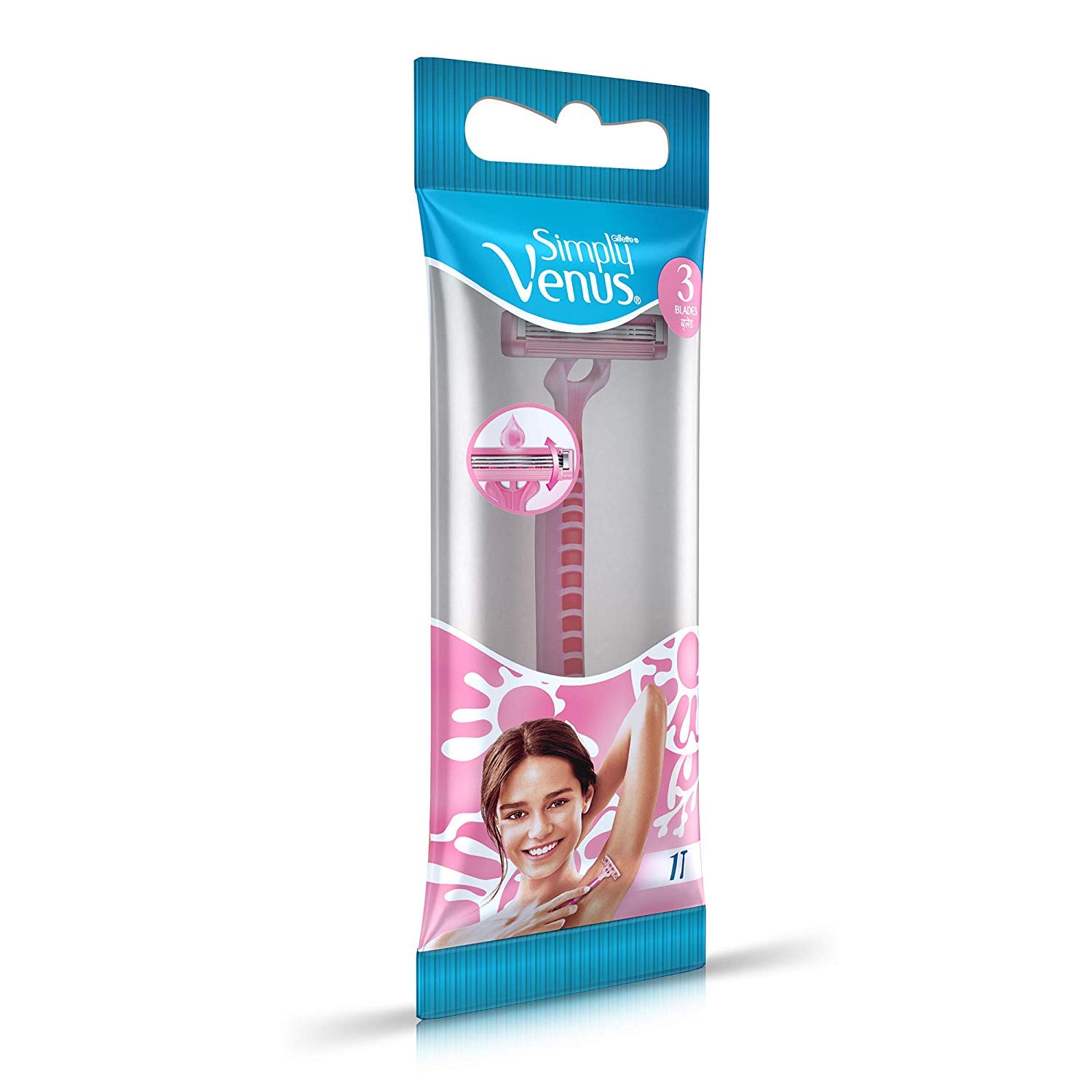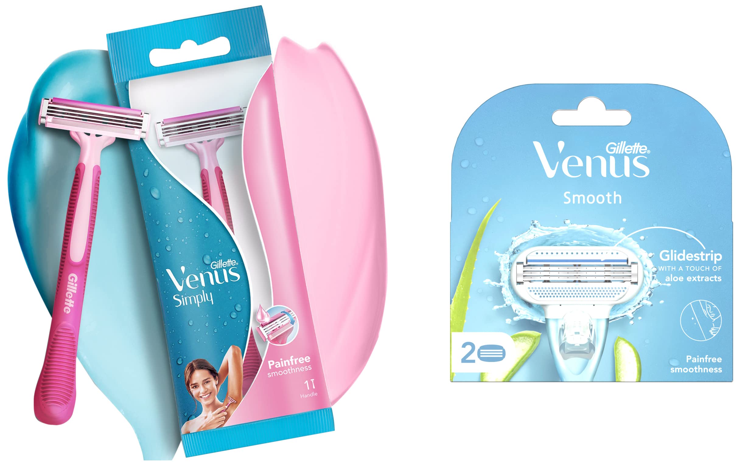 Gillette Venus Hair Removal Razor Blades/Refills/Cartridges for Women - 2 Pieces (Aloe Vera Glidestrip)Designed for women Gillette Venus glides smoothly along your curves and leaves with you smooth Venus skin. Simply apply water and soap glide Venus against the direction of hair growth and then wash and apply your favorite moisturizer! How to use: 1.Push out the old head (refill/blade) from your Venus by pressing the button. The button is in darker colour on the handle 2.Open the new refill/blade 3.Push the handle into the slot on the new refill/bladeGillette Venus Razor - (Pack of 1 Pink)Venus simply 3 use and throw razors provide you easy hair removal and smooth skin. Glide strip with aloe vera extracts 3 blades to leave you with smooth skin and flexible head which glides along your curves.