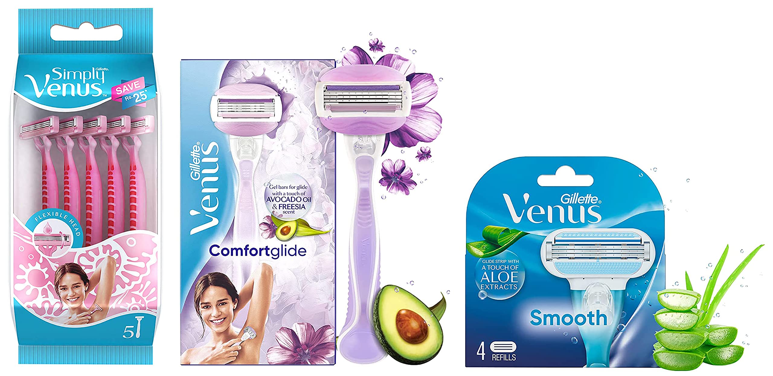 Gillette Venus Hair Removal Razor Blades/Refills/Cartridges for Women - 4 Pieces (Aloe Vera Glidestrip)Gillette Venus Hair Removal Razor Blades/Refills/Cartridges for Women - 4 Pieces (Aloe Vera) Glide strip with aloe vera extracts and vitamin E Flexible pivoting head that glides smoothly along your curves Rounded head with three movable blades that removes even fine hair by Procter and GambleGillette Venus Comfortglide Hair Removal Razor for Women with Avocado Oils & Body Butter Freesia Scent 1 PcGillette Venus Breeze is the perfect solution for smooth and easy hair removal razor for women. Simply apply water glide Venus Breeze against the direction of hair growth and then wash and apply your favorite moisturizer! The in-built gel bars with avocado oil for glide and freesia scent contain rich body butters and leave you with your smooth Venus skin in a few minutes! Each refill lasts 2 months (depending on usage - basis full body hair removal once a week) post which you can purchase the refills pack. This hair remover can be used by any woman/girl on face arms underarms legs and full body including the sensitive bikini area.Gillette Venus Simply Venus Pink Hair Removal for Women - 5 razors (B4G1)Designed as an easy to use hair removal razor for women âsimply venus 3â use and throw disposable razors provide you easy hair removal and smooth skin . Simply apply water glide venus razor against the direction of the hair growth and then wash and apply your favourite moisturizer. You can use simply venus 3 for hair removal for 3 weeks.This hair remover can be used by any woman/girl on face arms underarms legs and full body including the sensitive bikini area.