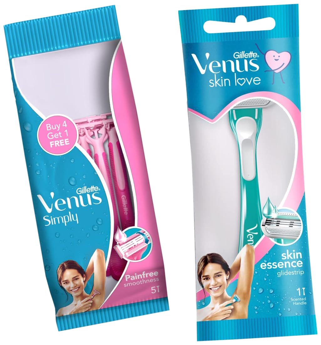 Gillette Venus Skin Love With Skin Essence Womens Razor For Hair Removal- Pack Of 1, Green&Gillette Venus Simply Venus Pink Hair Removal for Women - 5 razors (Buy 4,Get 1 free)