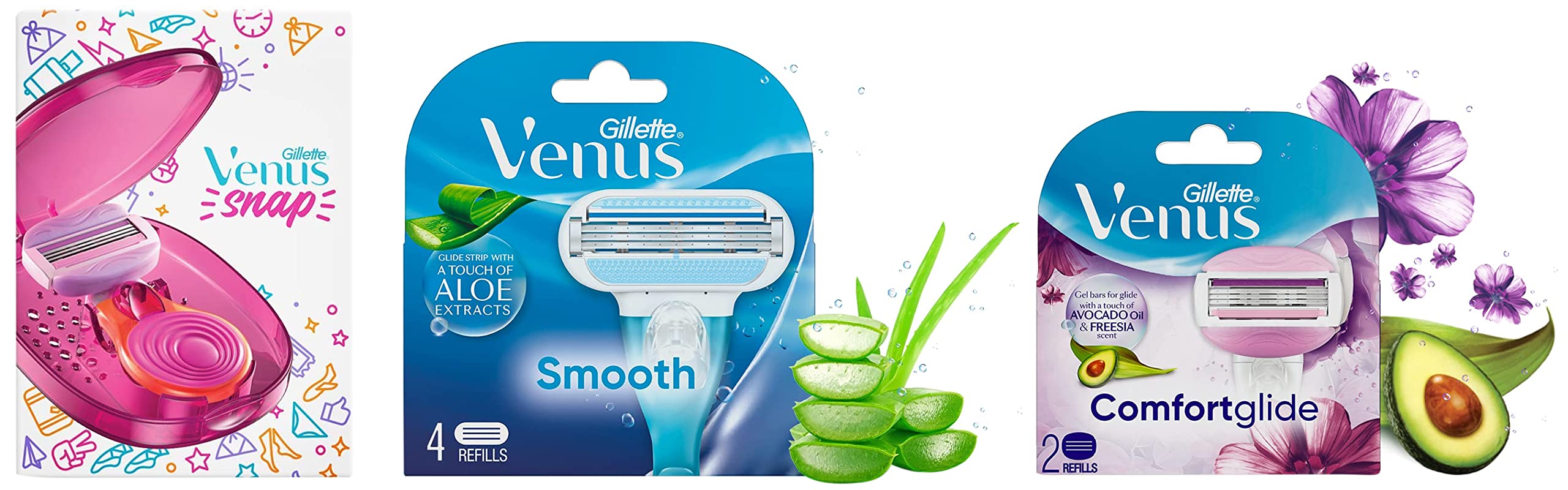Gillette Venus Snap Hair Remover for Smooth Skin - Women RazorDesigned for women Gillette Venus Snap glides smoothly along your curves leaving you with smooth skin that glows naturally! Much like your compact Snap comes in a cute pink case with three refills that can last up to 6 months. Snap removes dead skin cells as it exfoliates your skin while the moisturizing avocado oil and body butter keeps skin soft and smooth. Just apply water glide the Snap against the direction of hair growth wash and apply your favorite moisturizer! The pack has 3 refills each of which lasts approx. 2 months (depending on usage - basis full body hair removal once a week). This hair remover can be used by any woman/girl on her face arms underarms legs and the full body including the sensitive bikini area.Gillette Venus Comfortglide Hair Removal Razor Blades/Refills/Cartridges for Women - 2 Pieces (Avocado Oils & Freesia scent soap gel bars)Gillette Venus Breeze is the perfect solution for smooth and easy hair removal. Simply apply water glide Venus Breeze against the direction of hair growth and then wash and apply your favorite moisturizer! The in-built gel bars with avocado oil for glide and freesia scent contain rich body butters and leave you with your smooth Venus skin in a few minutes! Simply wet your skin glide Venus against the direction of hair growth and then wash and apply your favorite moisturizer! How to use: 1. Push out the old head (refill/blade) from your Venus by pressing the button. The button is in darker colour on the handle 2.Open the new refill/blade 3.Push the handle into the slot on the new refill/bladeGillette Venus Hair Removal Razor Blades/Refills/Cartridges for Women - 4 Pieces (Aloe Vera Glidestrip)Gillette Venus Hair Removal Razor Blades/Refills/Cartridges for Women - 4 Pieces (Aloe Vera) Glide strip with aloe vera extracts and vitamin E Flexible pivoting head that glides smoothly along your curves Rounded head with three movable blades that removes even fine hair by Procter and Gamble