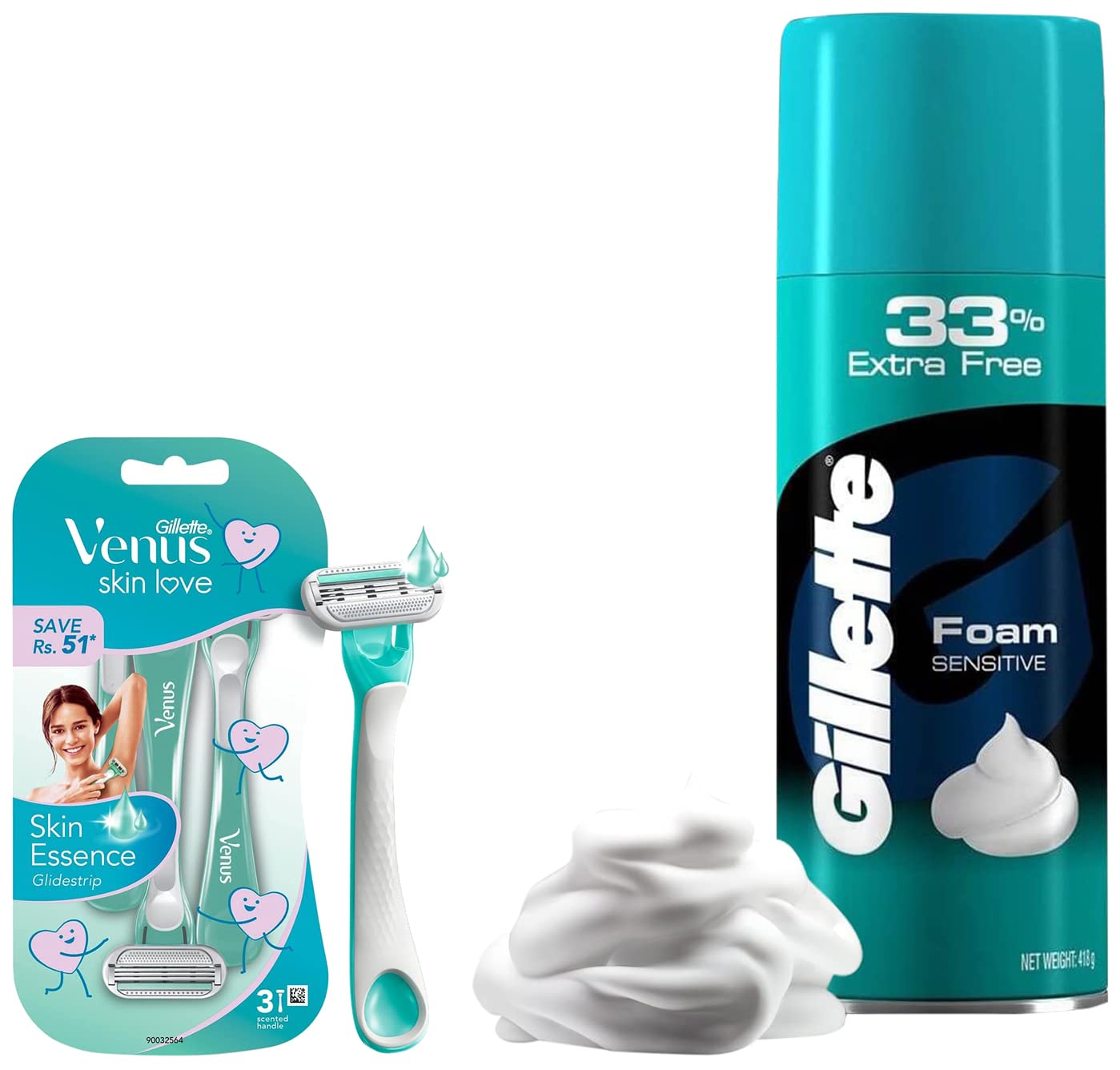 Gillette Women's Venus Skin Love with Skin Essence Razor for Hair Removal - Green Pack of 3Gillette Venus Skin Love is designed with a special glide-strip containing Skin Essence that hydrates and protects your skin giving it a super smooth finish after hair removal! It is a pack of 3 use and throw disposable razors with easy to grip scented handle. The dual finger rest and flexible head helps you grip your Venus better as it moves along your curves easily when you?re using it in the shower. Just apply water and soap glide your Venus against the direction of hair growth and then wash and apply your favorite moisturizer!Gillette Classic Sensitive Shave Foam - 418 g (33% extra)Simple.Honest.Classic. That's the Gillette Foam shave. The lightly fragranced for Sensitive Skin lather spreads easily and rinses clean for that Foam shave men have enjoyed for generations.
