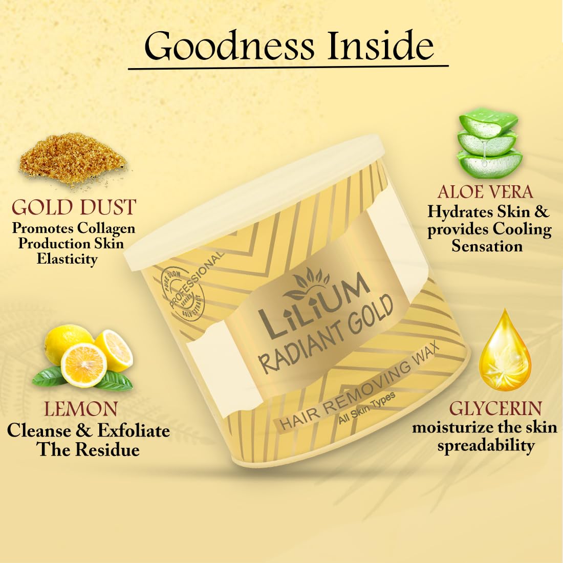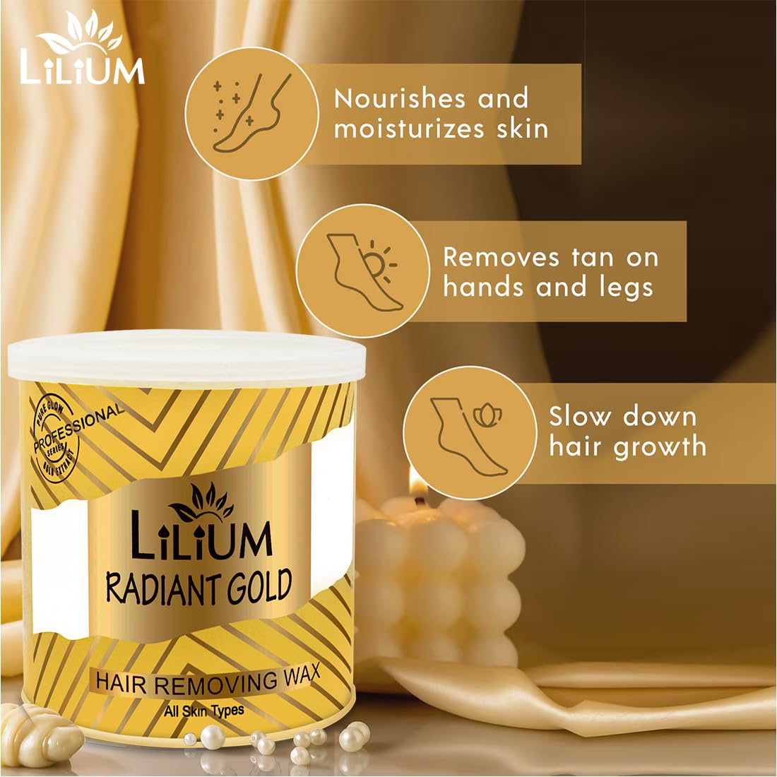 Lilium Gold Hair Removing Wax is a premium hair removal product designed to deliver salon-quality results in the comfort of your own home. Crafted with care and enriched with moisturizing agents this luxurious wax effectively removes unwanted hair while leaving your skin feeling soft and smooth. Easy to apply and suitable for use on various body parts Lilium Gold Hair Removing Wax offers a hassle-free hair removal experience with long-lasting results. Elevate your beauty routine and indulge in the opulent sensation of gold with our exquisite hair removal wax.