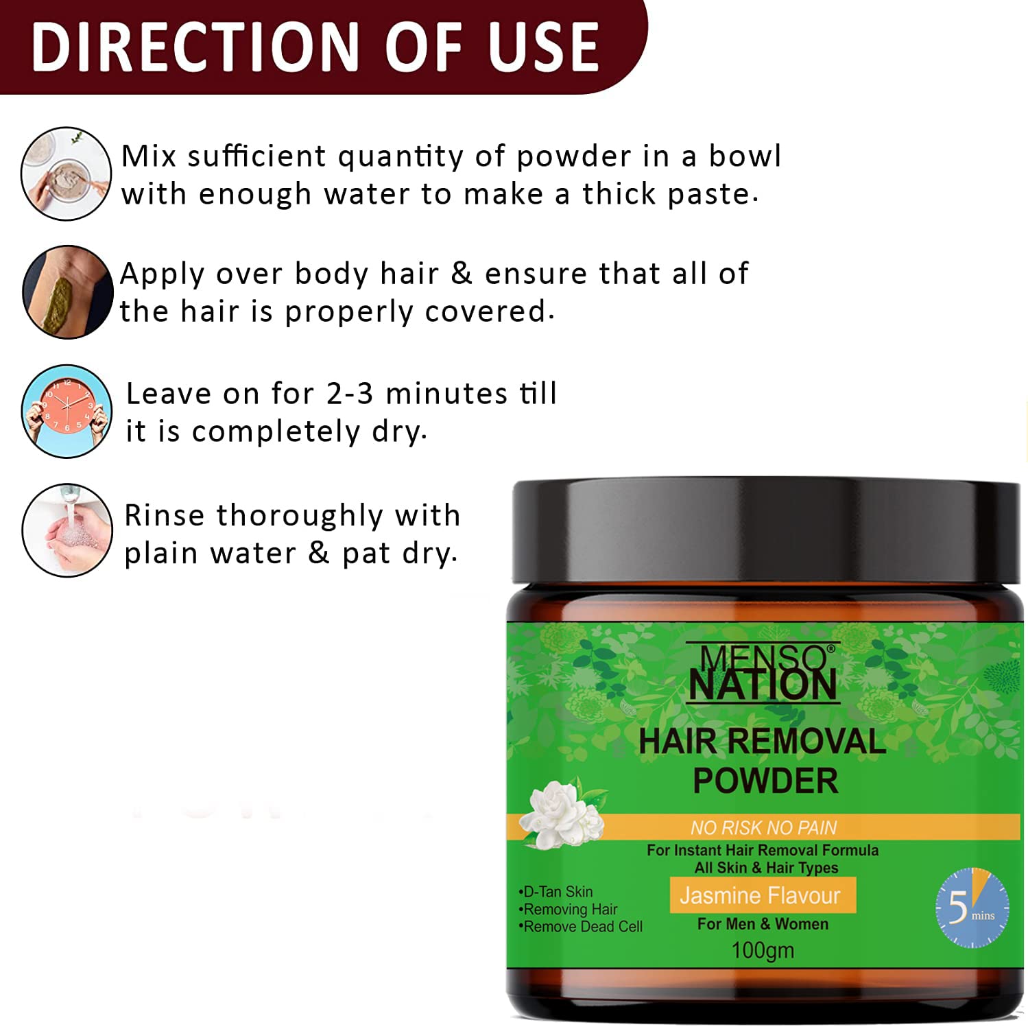 • Application: just mix this hair removal powder with water to make a paste and apply on desired area for maximum 6-8 minutes and wipe with a damp cloth upward with bit firm hands