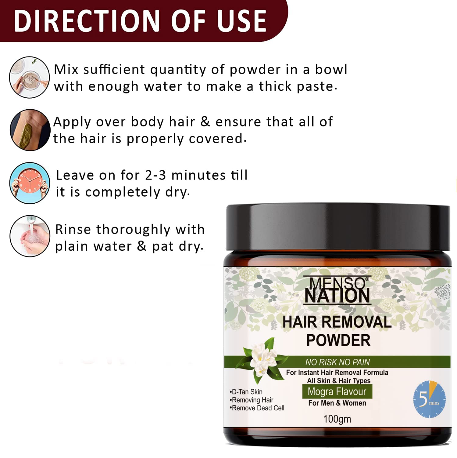 • Application: just mix this hair removal powder with water to make a paste and apply on desired area for maximum 6-8 minutes and wipe with a damp cloth upward with bit firm hands
